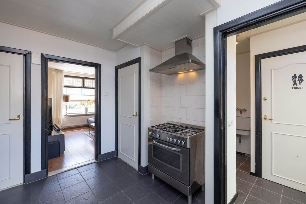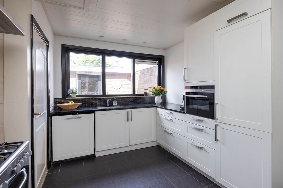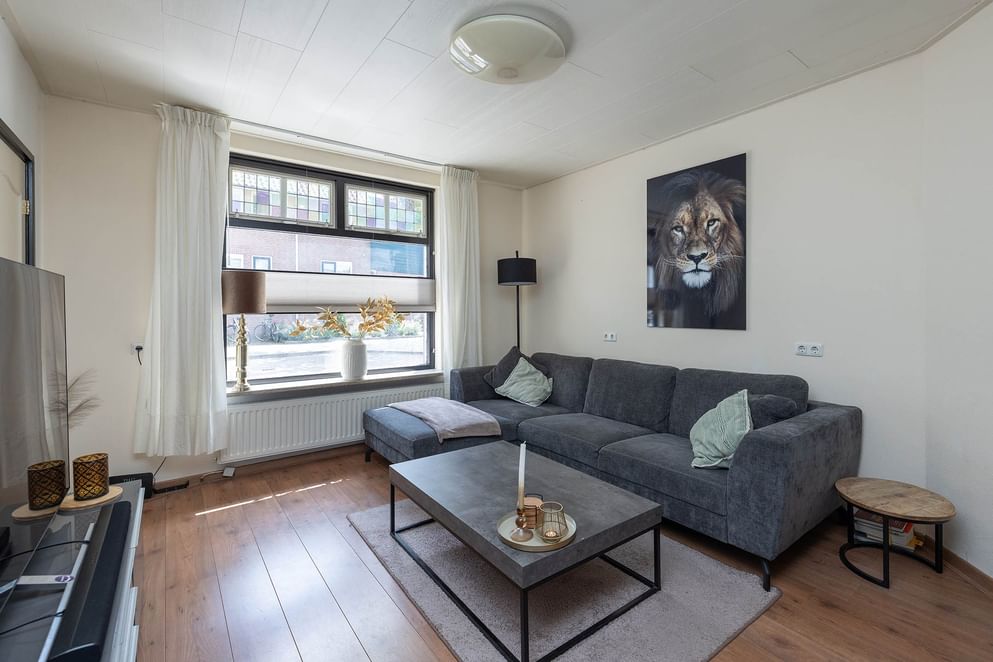 De woning is netjes afgewerkt en biedt alles wat je nodig hebt om comfortabel te wonen zonder direct te hoeven klussen. Je komt binnen in de woonkamer met grote ramen, waardoor er veel natuurlijk licht naar binnen valt. De sfeervolle glas-in-looddetails geven het geheel extra karakter en een warme uitstraling. Aansluitend vind je de keuken, die direct toegang biedt tot de onderhoudsvriendelijke achtertuin. Deze ligt op het noordwesten, wat betekent dat je na werk of studie heerlijk kunt genieten van de middag- en avondzon. Ideaal voor een borrel met vrienden of een ontspannen diner in de buitenlucht.