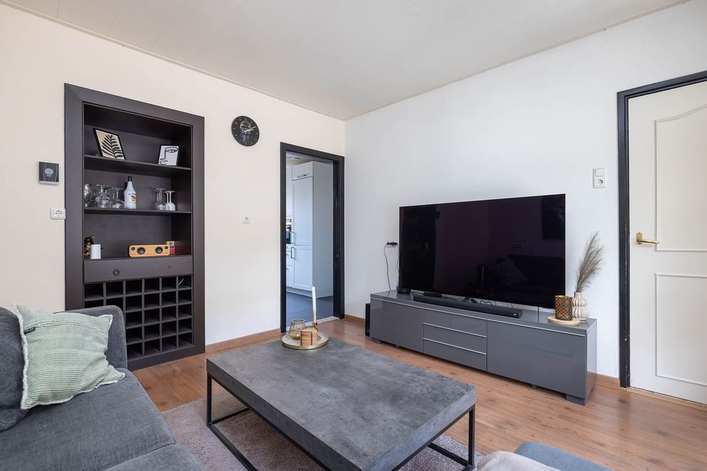 Je komt binnen in de hal, waar zich de trap naar de eerste verdieping en de meterkast bevinden. Vanuit de hal stap je de woonkamer in, die direct een gezellige en warme sfeer uitstraalt. Aansluitend loop je door naar de dichte keuken. Deze is praktisch ingericht en voorzien van diverse inbouwapparatuur, zoals een combimagnetron, koelkast, vaatwasser, een RVS spoelbak en een granieten werkblad. Het vrijstaande 5-pits gasfornuis met afzuigkap is fraai weggewerkt in een nis, wat zorgt voor een strakke en opgeruimde uitstraling. De keuken biedt toegang tot zowel een kelderkast als een trapkast, ideaal voor extra voorraad- en opbergruimte. Ook is er een berging met een uitstortgootsteen, opstelplaats voor de CV-ketel, een praktische opbergkast en een toiletruimte met wandcloset.