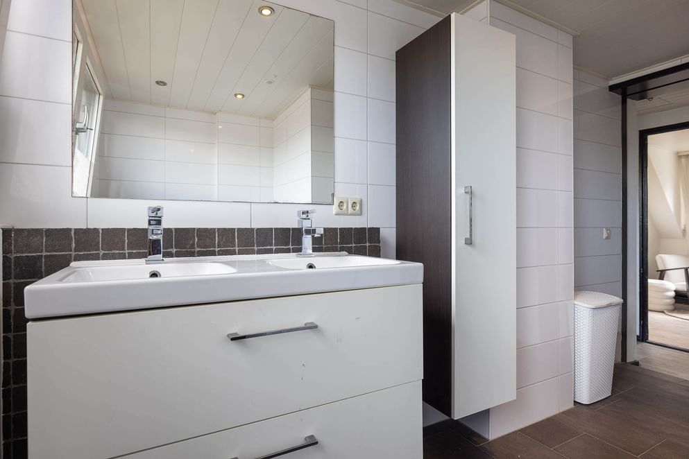 Via een vaste trap kom je op de overloop van de eerste verdieping. Hier bevinden zich twee slaapkamers waarvan de grote slaapkamer is voorzien van een vaste kast en een wastafel. De ruime, moderne badkamer is voorzien van een dubbele wastafel met stijlvol meubel, een royale inloopdouche en een tweede toilet.