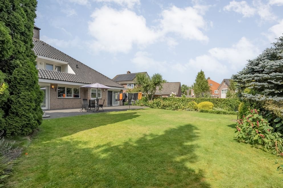 De woning beschikt over een ruime achtertuin met een groot zonneterras, dat ook via een zijpad bereikbaar is. De tuin ligt op het zuidoosten, waardoor je de hele dag van de zon kunt genieten – ideaal voor ontspanning of gezellig borrelen met vrienden en familie. Daarnaast is er volop parkeergelegenheid. De woning heeft een ruime, aangebouwde garage die groot genoeg is om een auto in te parkeren. Deze is voorzien van water, verwarming, elektriciteit en een elektrische garagedeur. Via een vlizotrap heb je hier toegang tot een praktische bergzolder. Aan de garage bevindt zich bovendien een carport. Verder beschikt de woning over een ruime oprit en hoort de parkeerplaats aan de straat ook bij de woning.