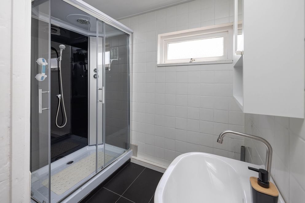 Via een vaste trap kom je op de overloop, die toegang geeft tot drie slaapkamers met vaste kastruimte. Daarnaast bevindt zich hier de badkamer met een douchecabine, wastafel en een aansluiting voor de wasmachine.