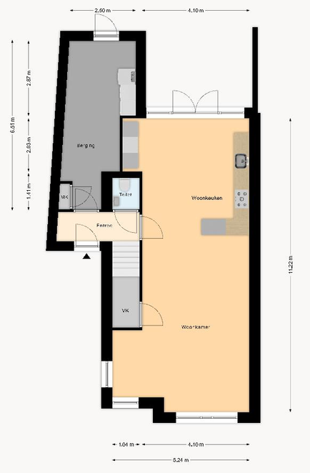 Entree naar de hal met trapopgang, berging, toiletruimte en ruime woonkeuken met openslaande deuren richting de tuin.