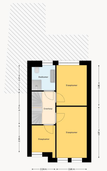 Overloop, badkamer, twee ruime slaapkamers en een hobbykamer
