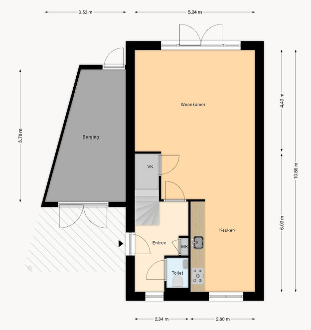 Entree naar de hal met trapopgang, berging, toiletruimte en ruime woonkeuken met openslaande deuren richting de tuin.