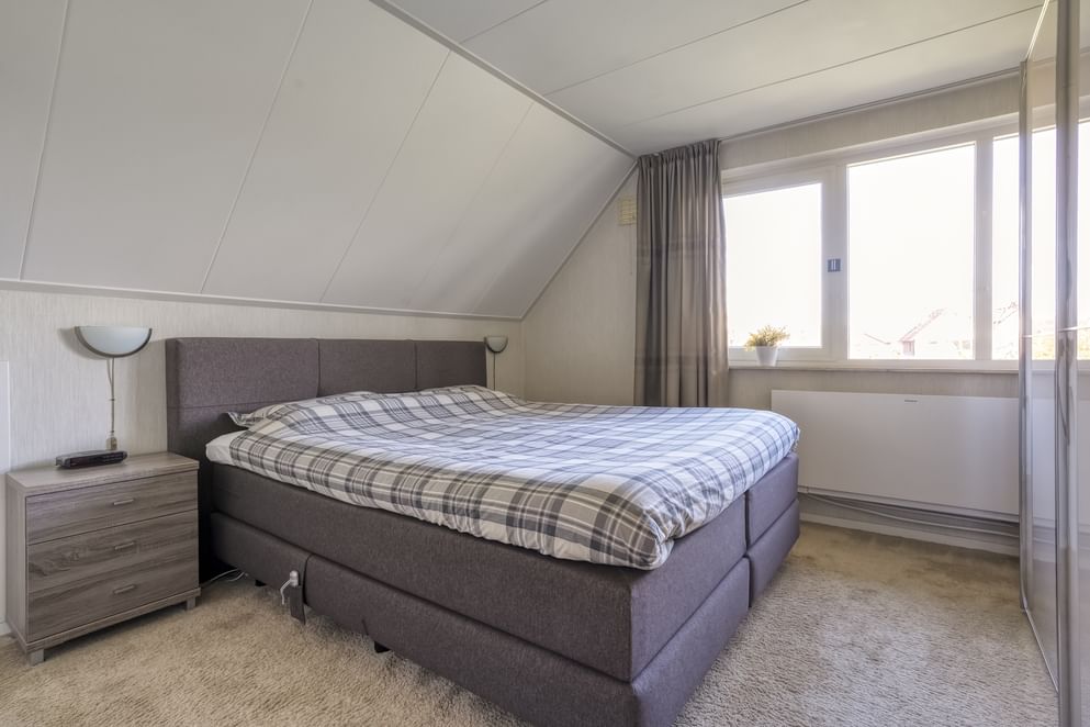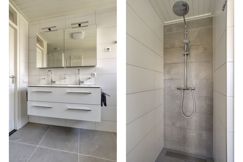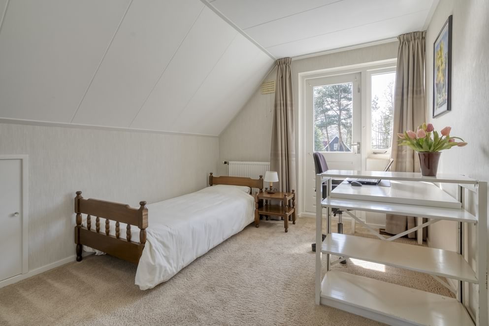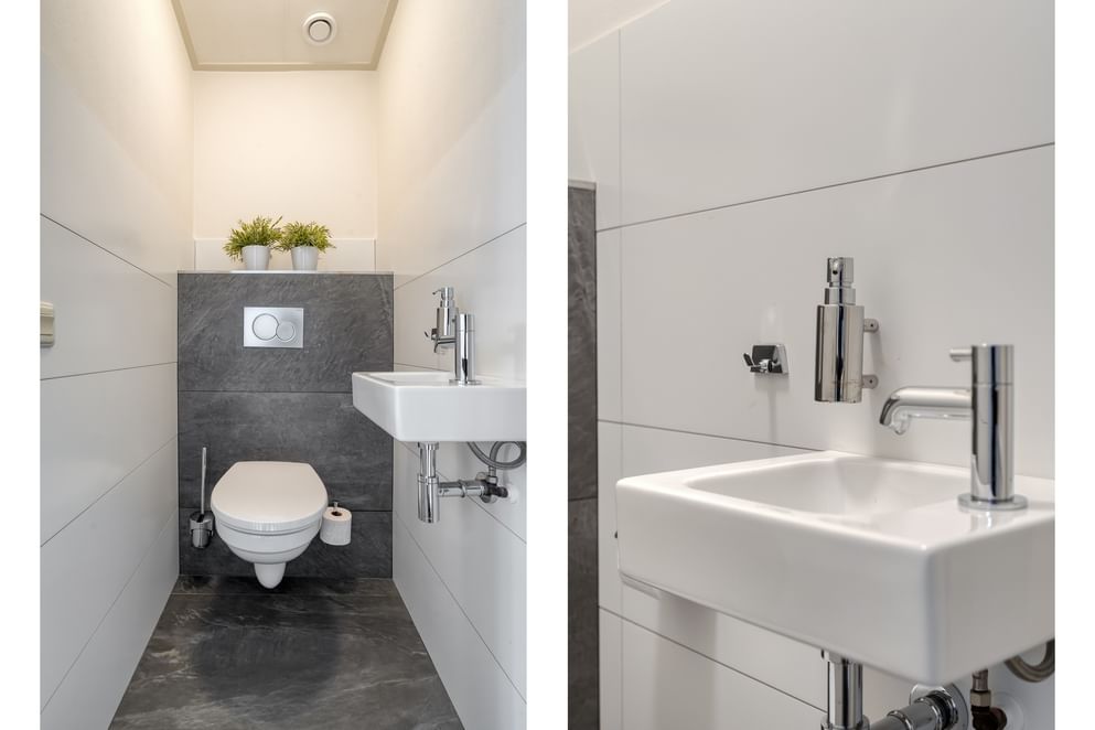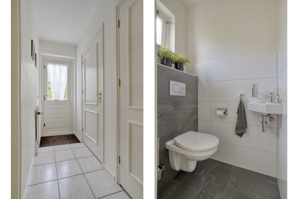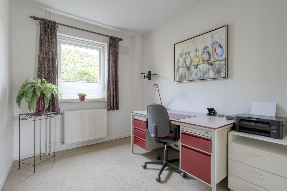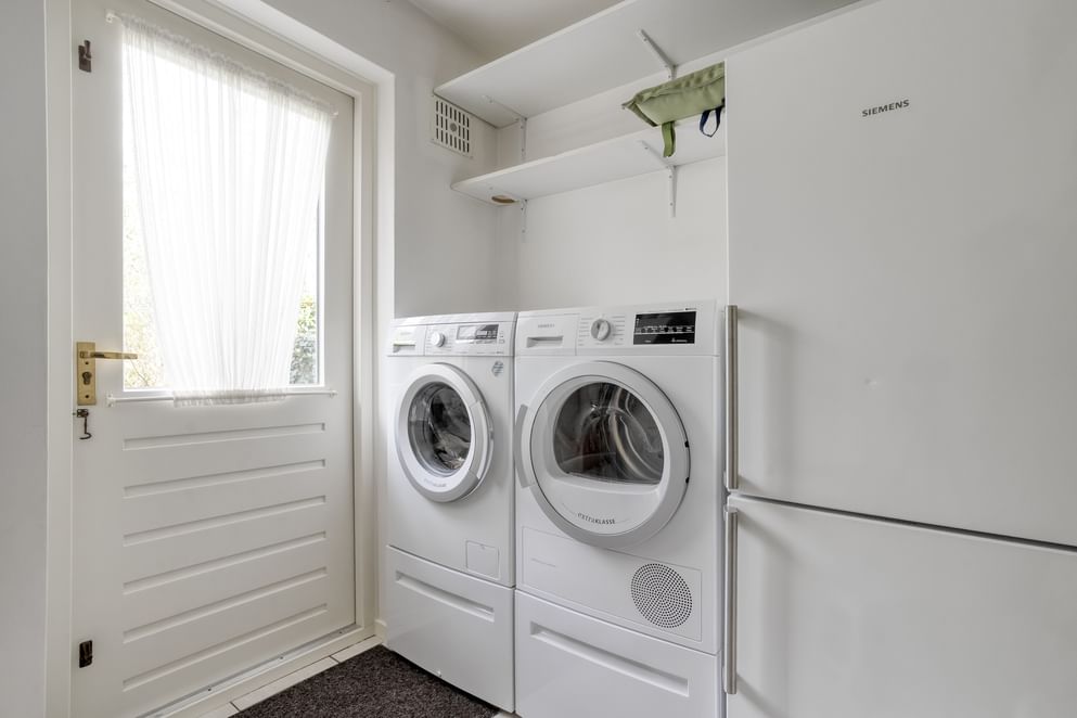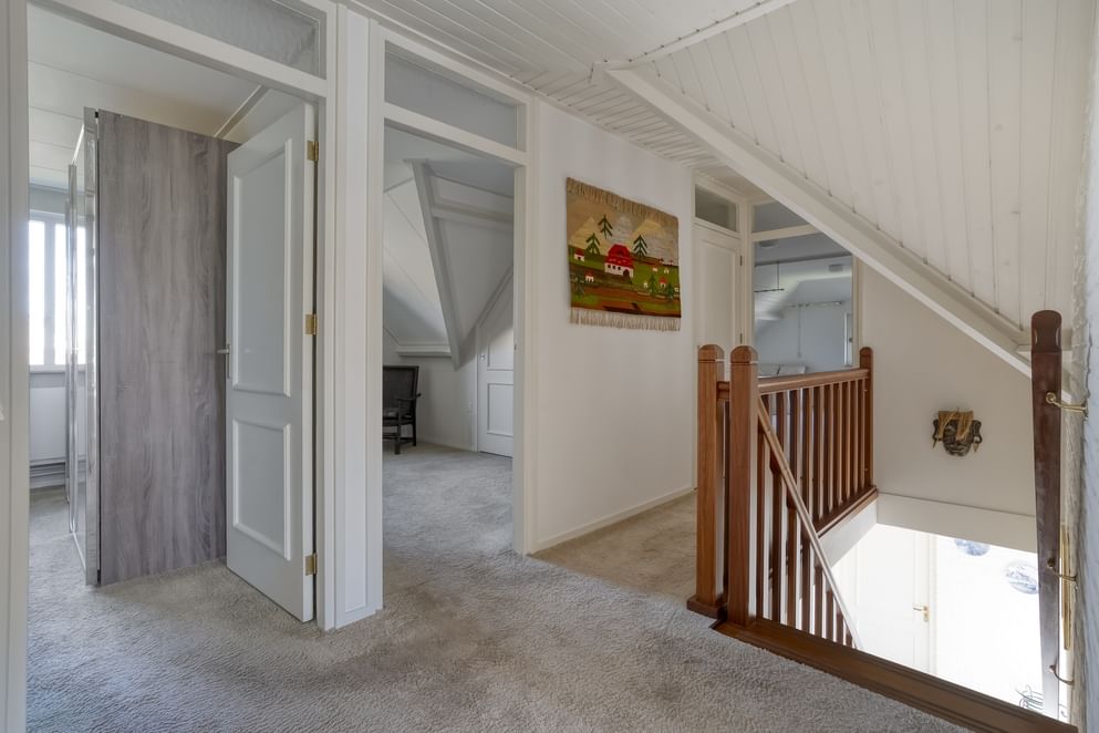 Vanuit de keuken kom je in een tussenhal met twee praktische vaste kasten en het toilet. Ook heb je hier toegang tot buiten, waardoor je eenvoudig de prachtige aangelegde zonnige tuin inloopt. Op de begane grond bevindt zich daarnaast een fraaie kantoorruimte en een aparte berging met witgoedaansluiting en wederom een deur naar buiten. Ook is er een ruime garage, ideaal voor het stallen van je auto, fietsen en tuingereedschap.