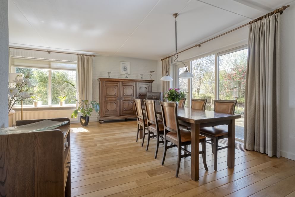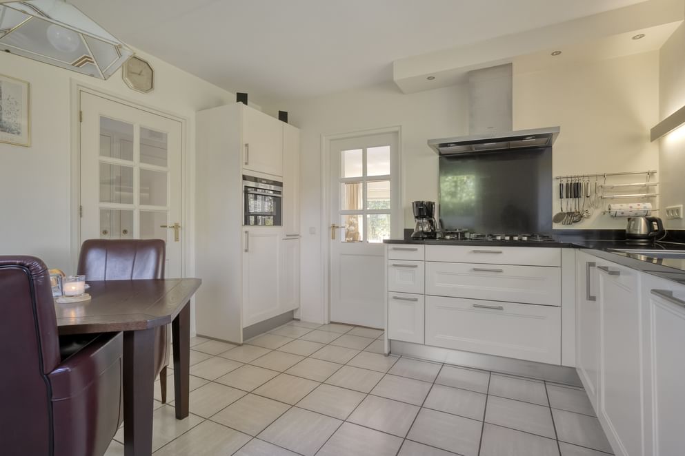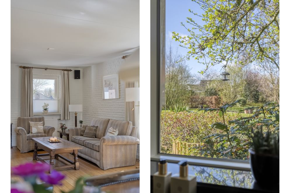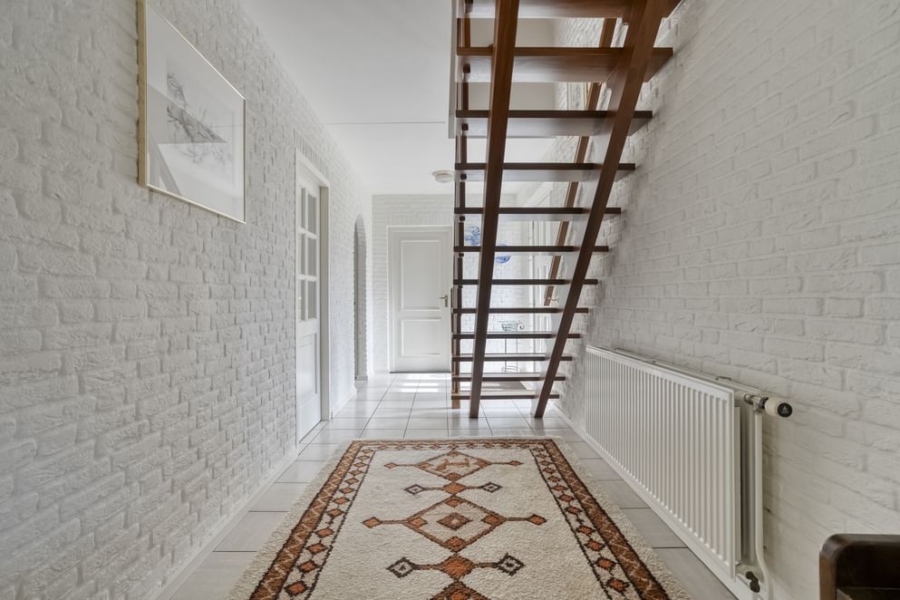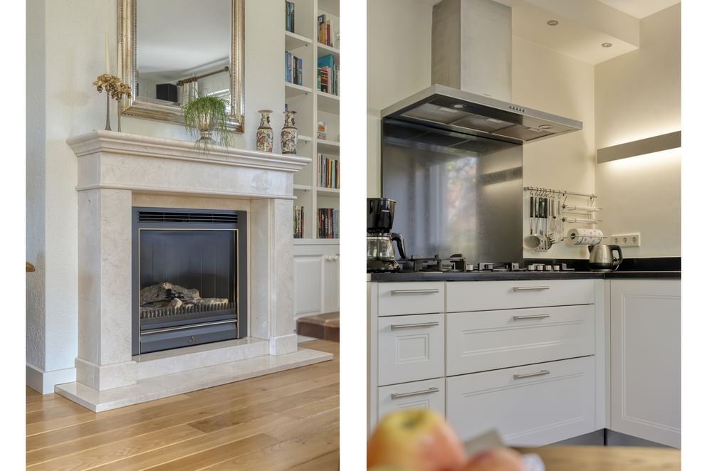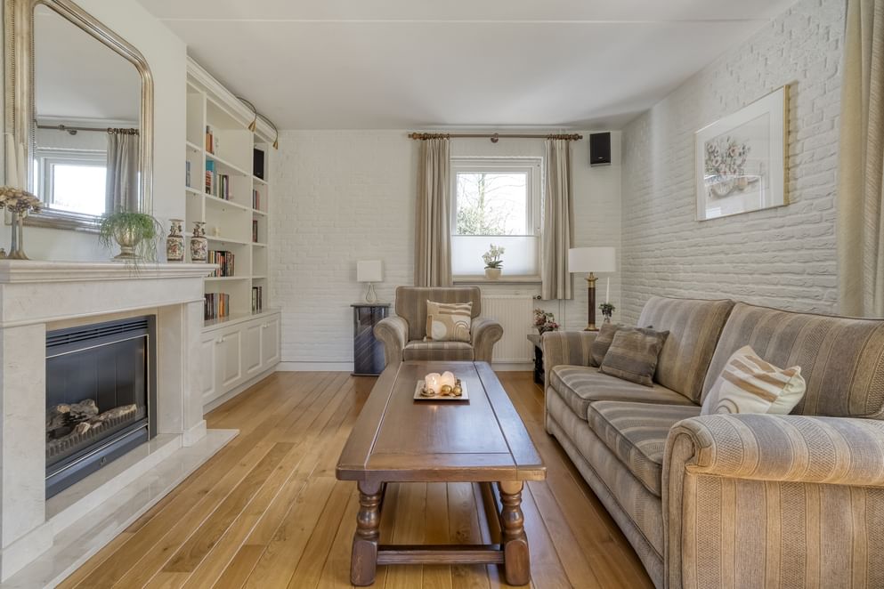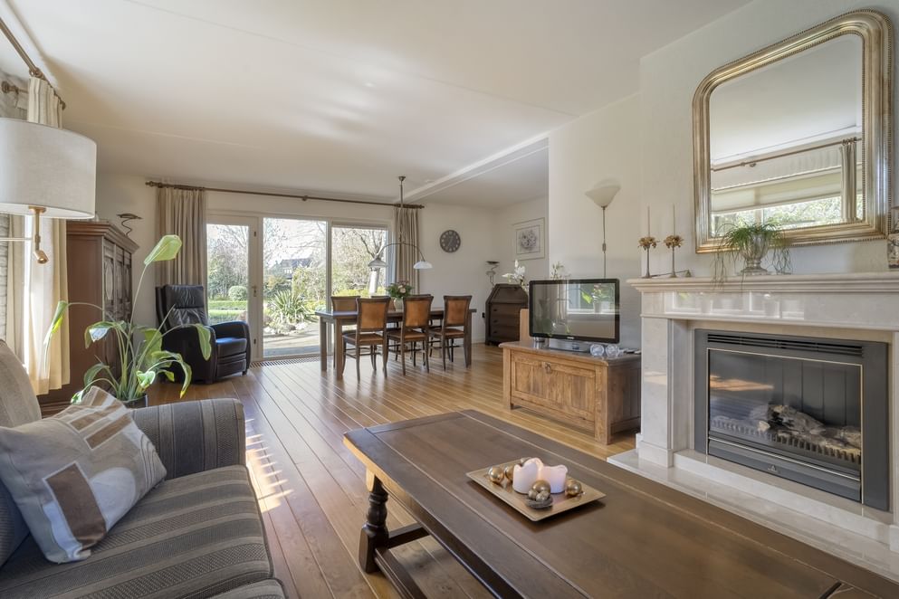 De hal leidt je naar de ruime en lichte woonkamer, die is uitgerust met een sfeervolle gashaard en een openslaande deur naar de tuin. Aansluitend vind je de gezellige keuken, voorzien van diverse inbouwapparatuur en plintboiler.