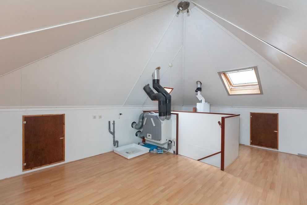 Met vaste trap te bereiken tweede verdieping met dakraam. Hier is plaats geboden voor wasmachine, droger en CV ketel. Deze etage is tevens te gebruiken als vierde slaapkamer.