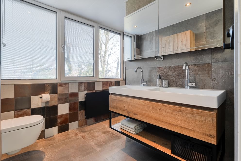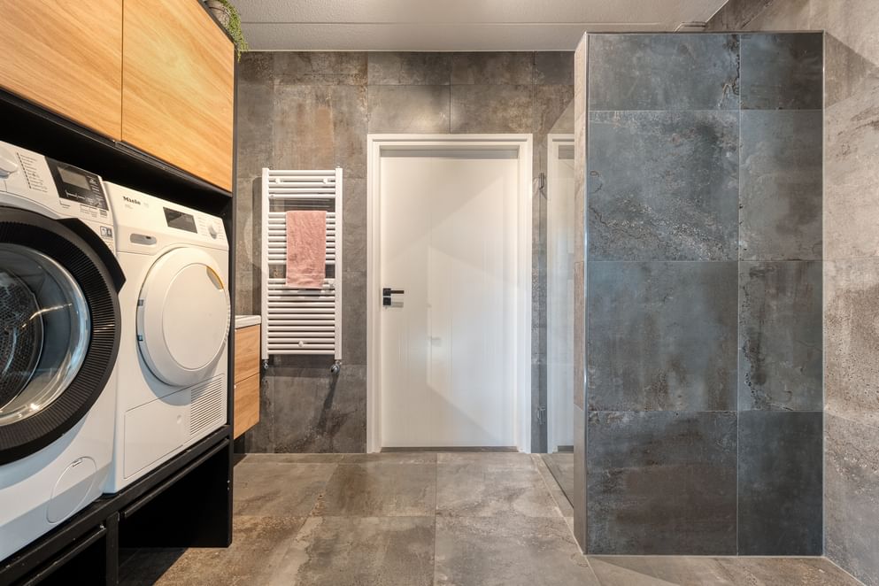 Het kantoor op de begane grond is eveneens vanuit de entree bereikbaar en biedt ook toegang tot de badkamer. Deze badkamer is uitgerust met een witgoedaansluiting, inloopdouche, wastafel en meubel. Het kantoor kan eenvoudig worden ingericht als slaapkamer, waardoor gelijkvloers wonen (slapen en baden op de begane grond) tot de mogelijkheden behoort.