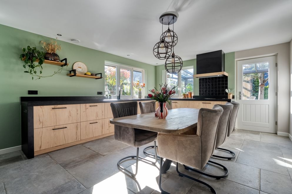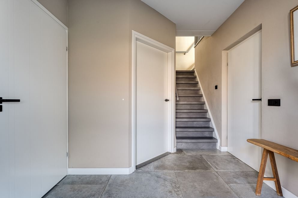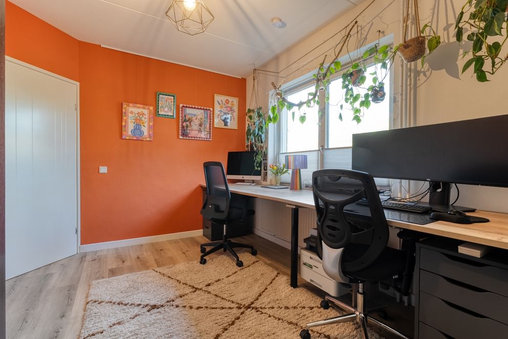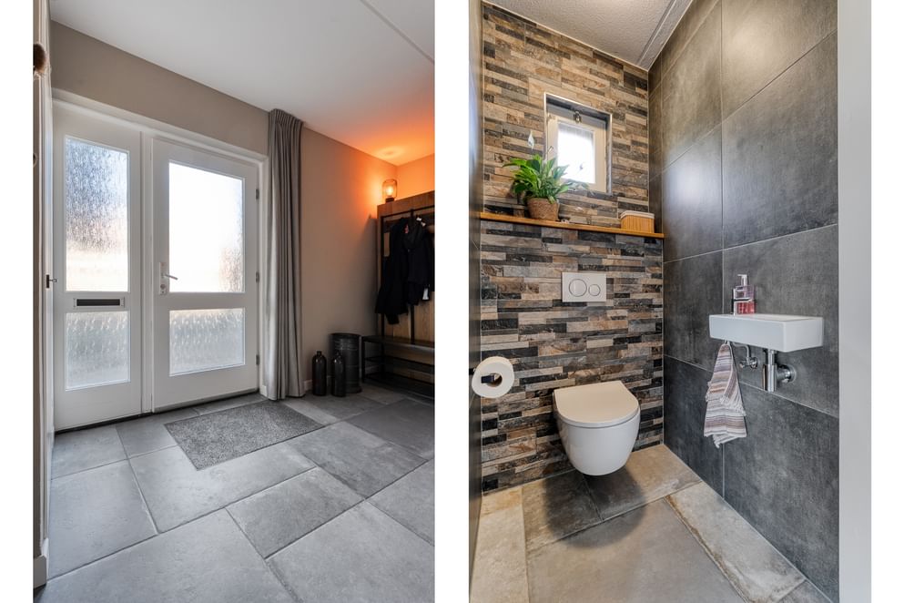 Je betreedt de woning via de entree, waar zich het toilet, de meterkast en de trapopgang naar de eerste verdieping bevinden. Vanuit hier heb je toegang tot zowel de woonkamer als het kantoor/de werkkamer. De ruime woonkamer is voorzien van een erker, trapkast en elektrische screens, en beschikt over een schuifpui naar de serre in de achtertuin. Aansluitend bereik je de keuken (2021), die is uitgerust met diverse inbouwapparatuur, waaronder een 5-zone inductiekookplaat, afzuigkap, vaatwasser, combi-oven, koelkast en Quooker. Vanuit de keuken is er directe toegang tot de garage en via een schuifdeur ook naar de badkamer op de begane grond. De garage is voorzien van water en elektra en beschikt over openslaande deuren en een loopdeur naar de achtertuin.