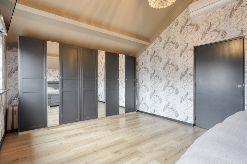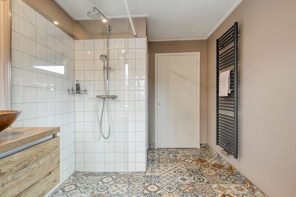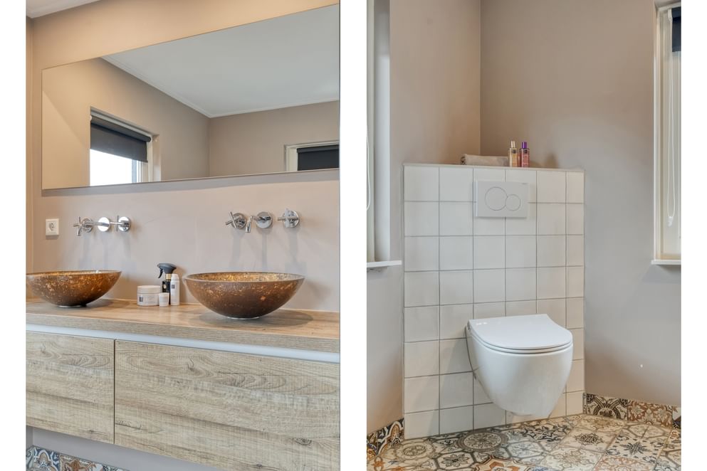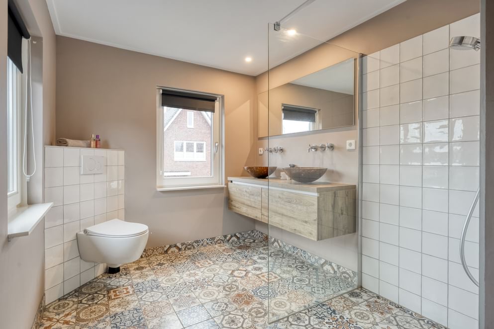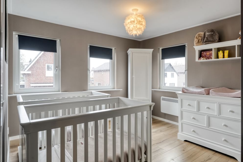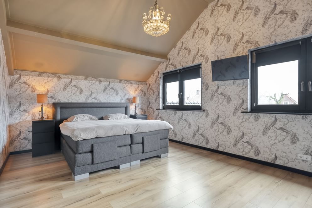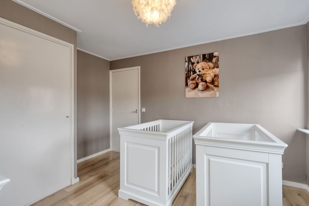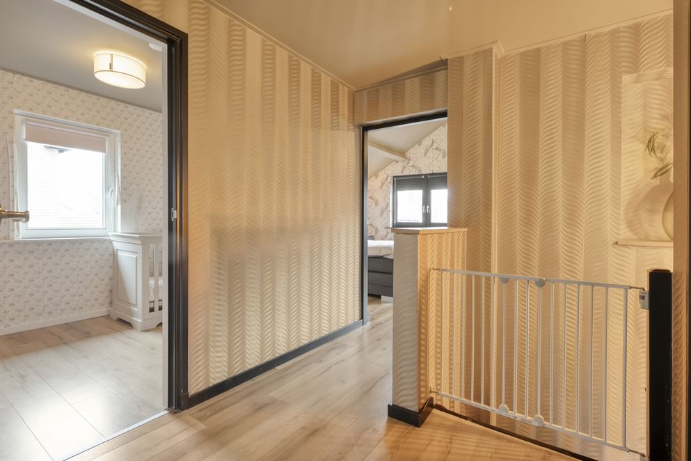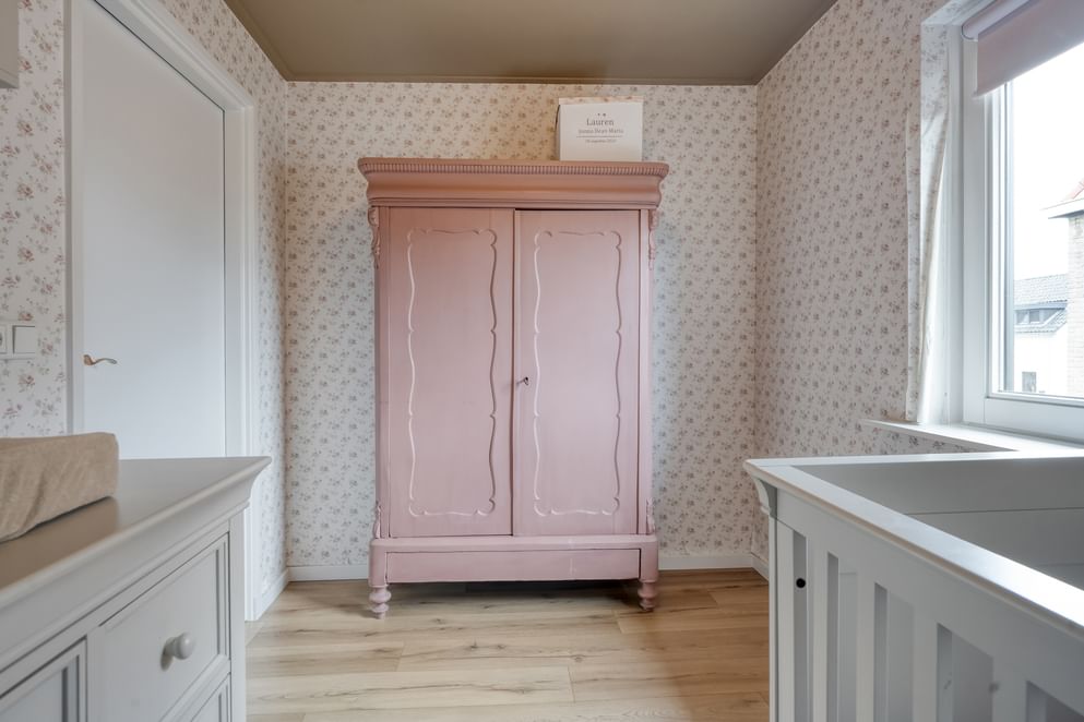 Op de eerste verdieping bevinden zich drie slaapkamers, waarvan twee royaal en waarvan één voorzien van een vaste kast. De grote nieuwe slaapkamer kan ook eenvoudig worden opgedeeld in twee slaapkamers, waarbij je zicht hebt tot in de nok. Daarnaast tref je op deze verdieping een praktische wasruimte en een zeer complete badkamer met een luxe uitstraling. De badkamer is uitgerust met een dubbele wastafel, toilet, inloopdouche en een vaste kast.