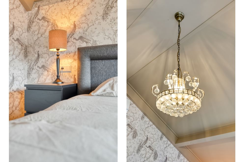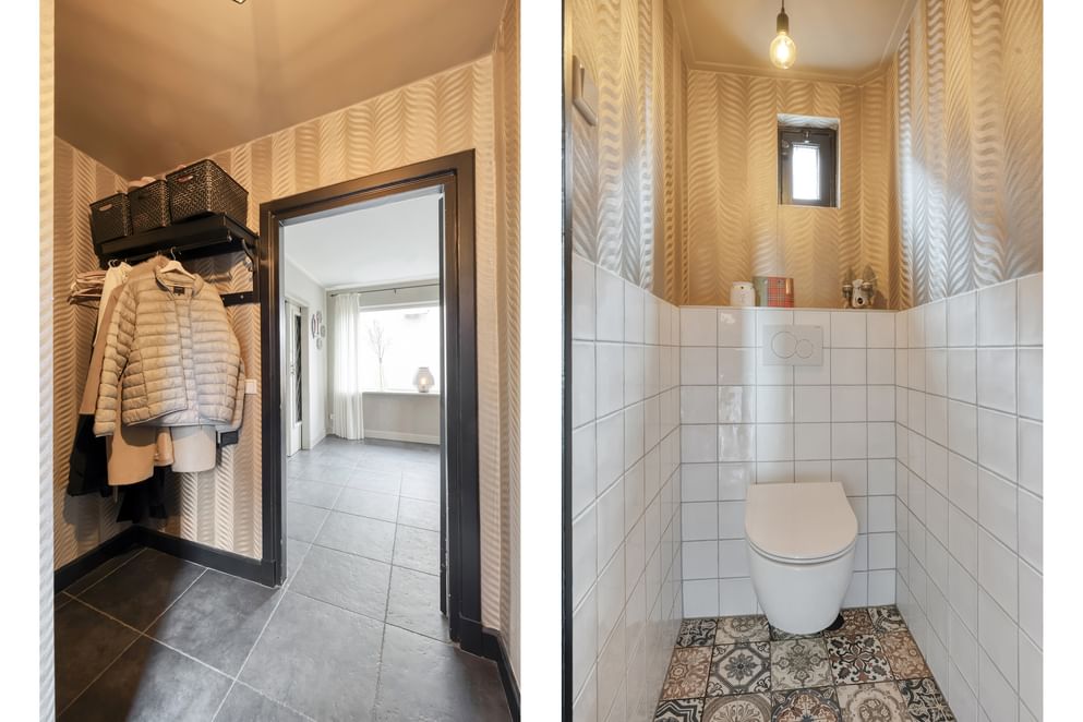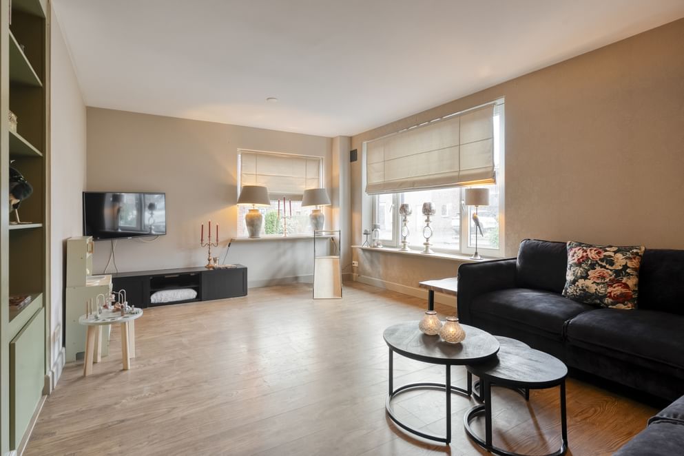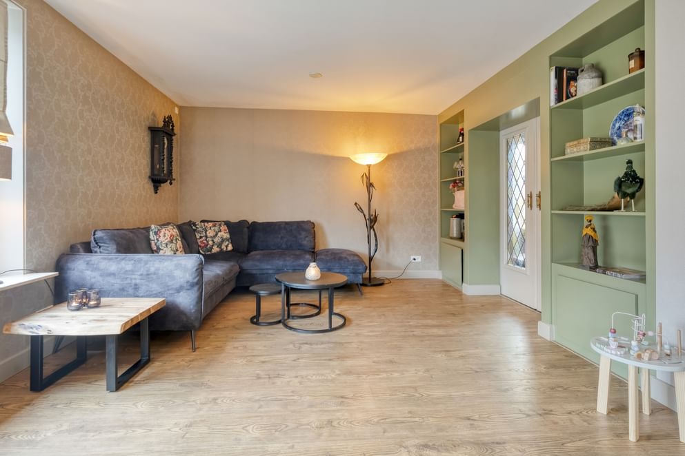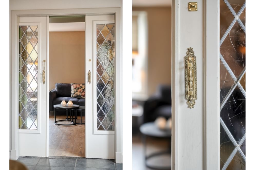 Vanuit de woonkeuken bereik je via stijlvolle ensuite deuren met karakteristieke glas-in-loodramen de sfeervolle woonkamer. Aan weerszijden van deze ensuite deuren bevinden zich ingebouwde open kasten, ideaal voor het stijlvol presenteren van accessoires of het inrichten als boekenkast.