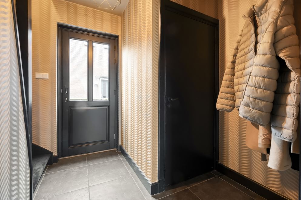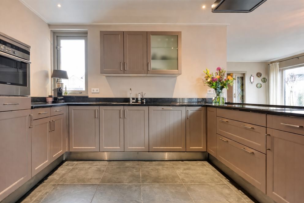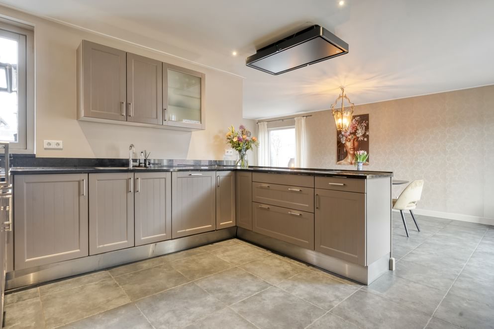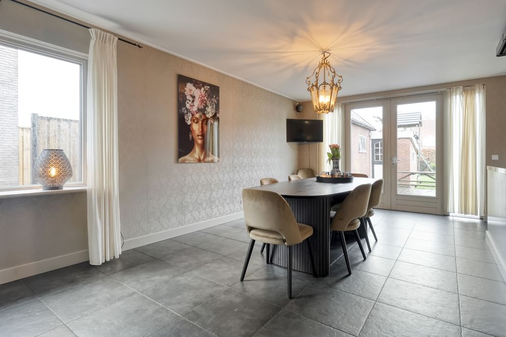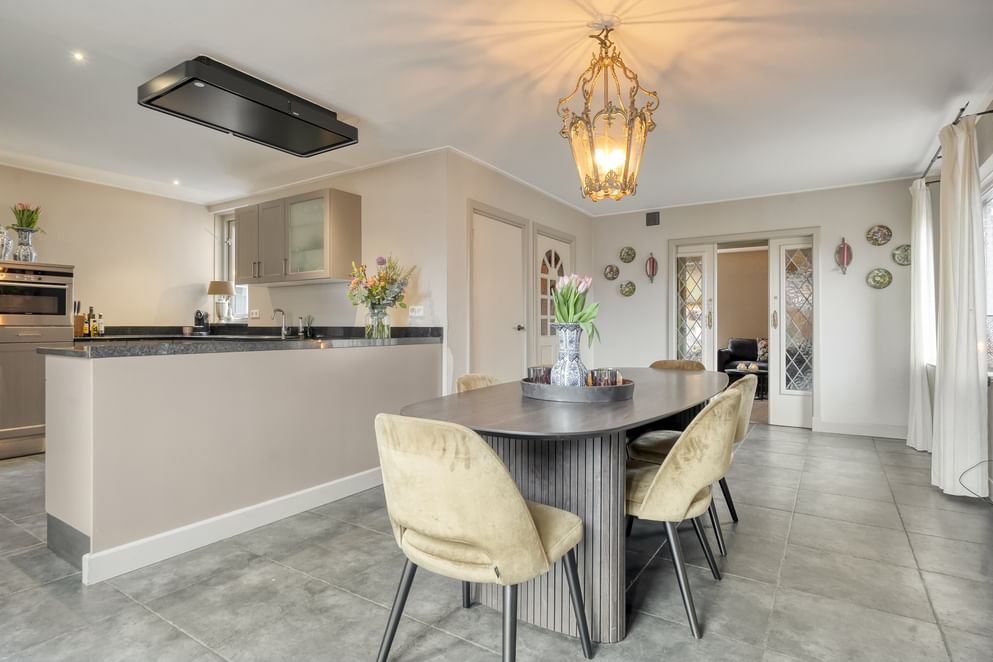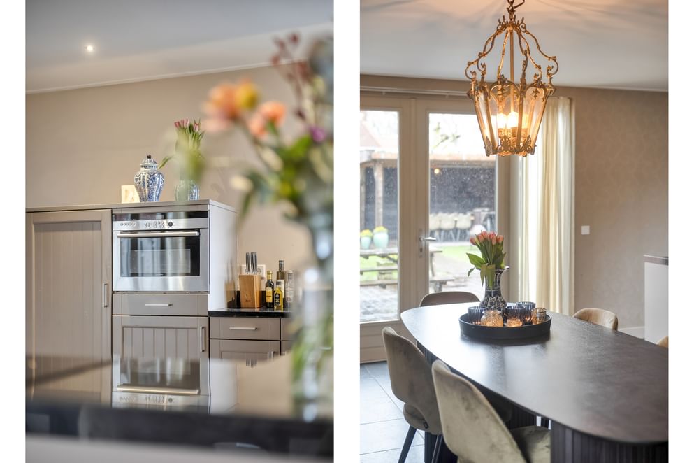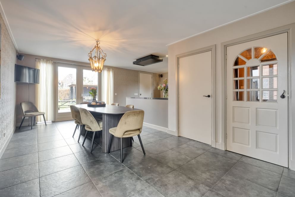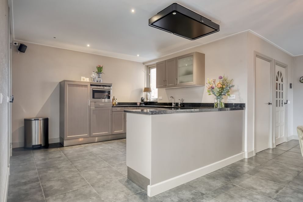 Middels twee openslaande deuren staat de woonkeuken in directe verbinding met de tuin, waardoor binnen en buiten naadloos in elkaar overlopen.