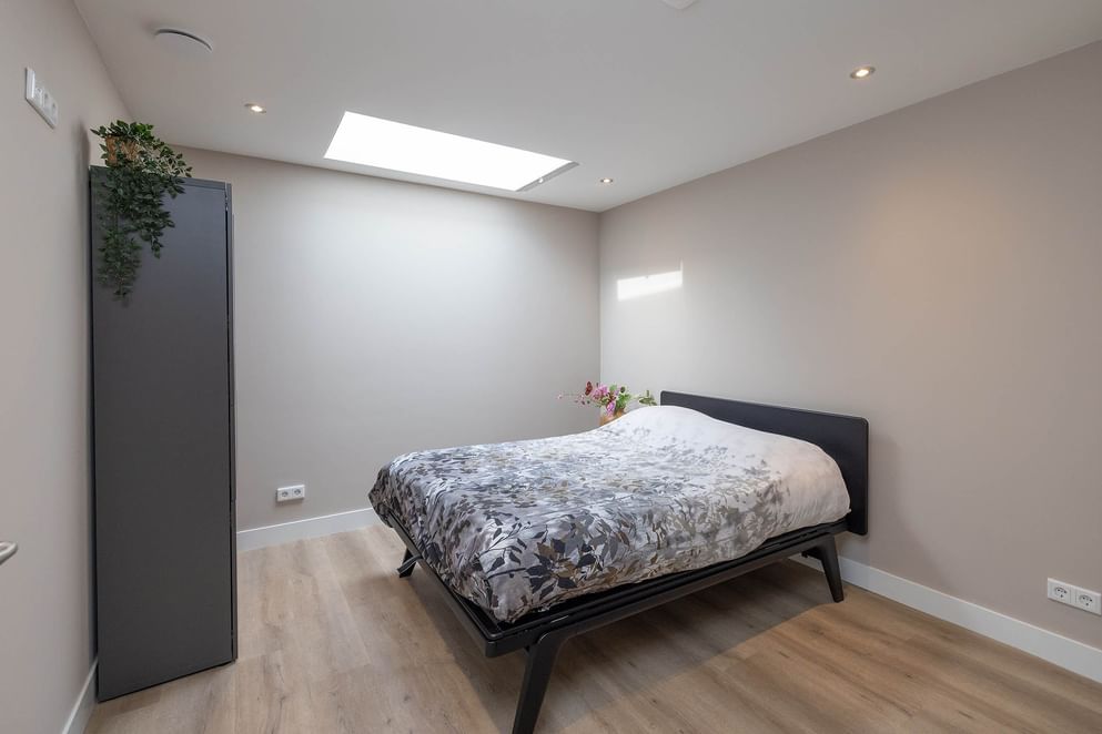 Via de voordeur kom je binnen in de entree met toilet. Vanuit hier heb je toegang tot de woonkamer, die ruim en licht aanvoelt dankzij de grote ramen. Aansluitend bevindt zich de open keuken, voorzien van diverse inbouwapparatuur. Door de open indeling lopen de woonkamer en keuken prettig in elkaar over, wat zorgt voor een fijne leefruimte. De woonkamer staat in verbinding met de hal, van waaruit de slaapkamer, badkamer en tweede kamer te bereiken zijn. De hoofdslaapkamer is ruim opgezet en biedt direct toegang tot de badkamer. Deze is uitgerust met een toilet, wastafelmeubel en inloopdouche. Aan de achterzijde van de woning bevindt zich een garage, ideaal voor het stallen van fietsen of het opbergen van spullen.