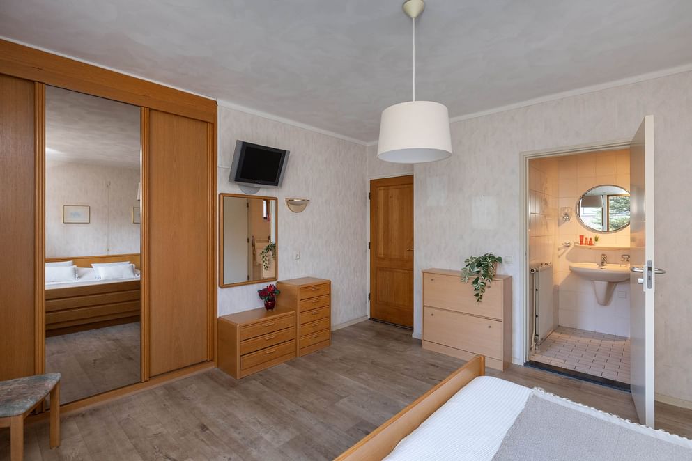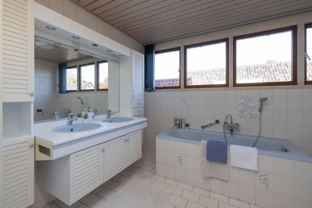 Vanaf de ruime overloop heb je toegang tot vier royale slaapkamers, met vaste kasten. Eén van de slaapkamers beschikt bovendien over een eigen wastafel. Vanuit de overloop bereik je tevens een aparte wasruimte, waar ook de cv-ketel is geïnstalleerd. De ruime badkamer is uitgerust met een toilet, ligbad, dubbele wastafelmeubel en douchecabine.