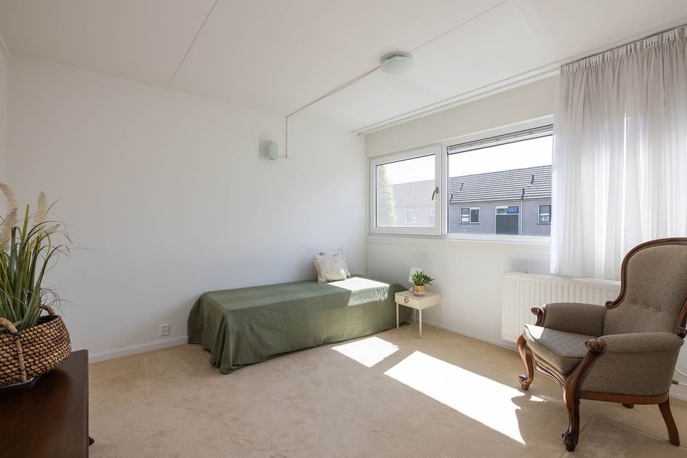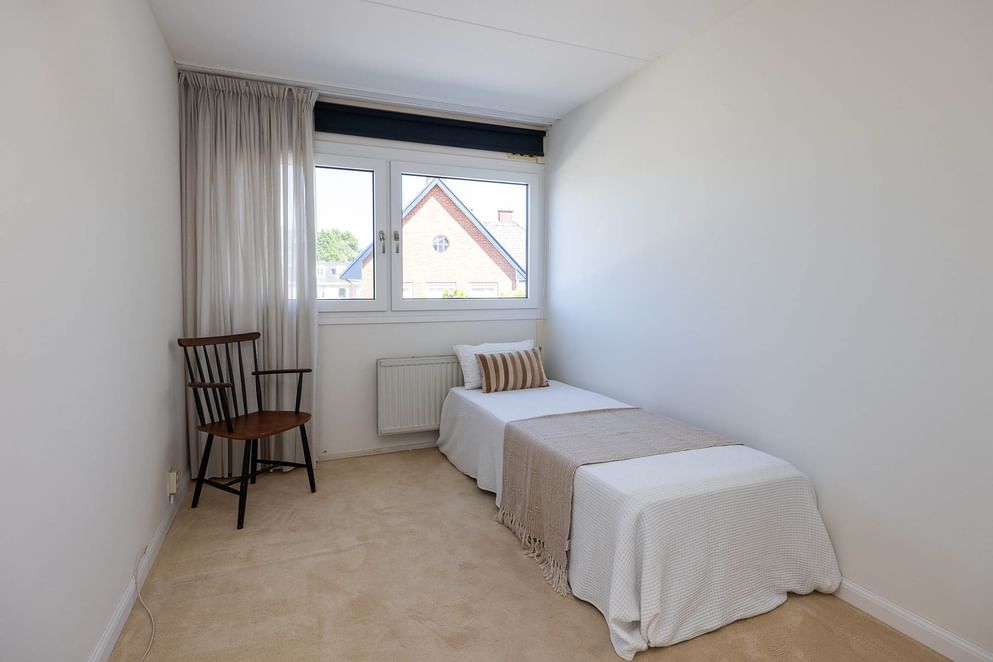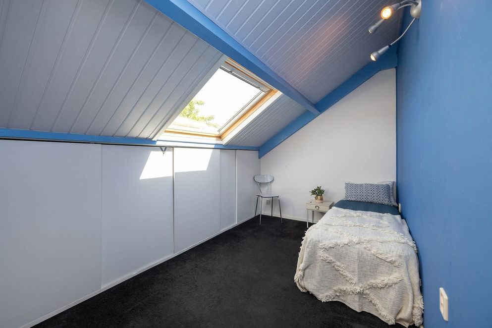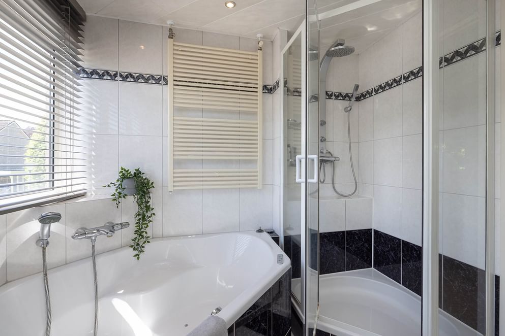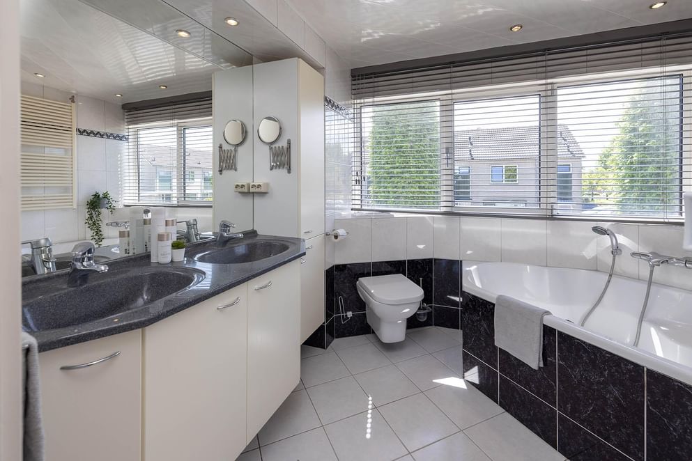 Op de eerste verdieping zijn drie slaapkamers. Twee kamers zijn ruim opgezet en bieden volop mogelijkheden voor een tweepersoonsbed en kastruimte. De derde kamer is iets compacter en daarmee goed geschikt als kinder- of werkkamer. De badkamer is compleet ingericht en voorzien van een hoekbad met whirlpoolfunctie, een aparte douche, dubbele wastafel en een toilet.