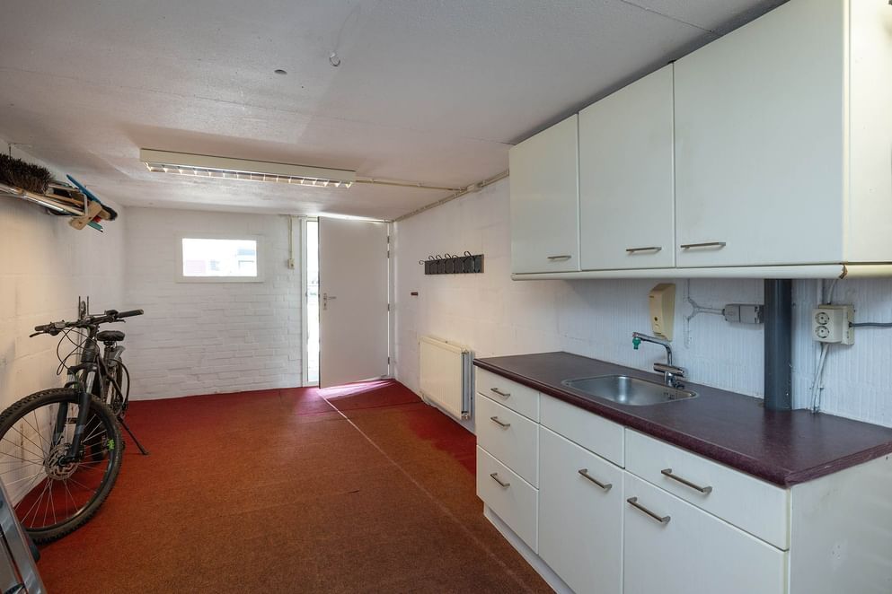 Je komt binnen in de hal, met hierin de meterkast, het toilet en de trap naar boven. Vervolgens kom je in de ruime woonkamer met ruimte voor zowel een zit- als een eethoek. Dankzij de schuifdeur tussen de keuken en woonkamer kun je de vertrekken van elkaar scheiden, maar blijft het geheel toch open en licht. De begane grond is voorzien van vloerverwarming. De keuken ligt aan de achterzijde van de woning en sluit mooi aan op het overdekte terras. Ten slotte kom je in de garage met carport aan de voorzijde, waar ruimte is voor opslag en het stallen van fietsen.