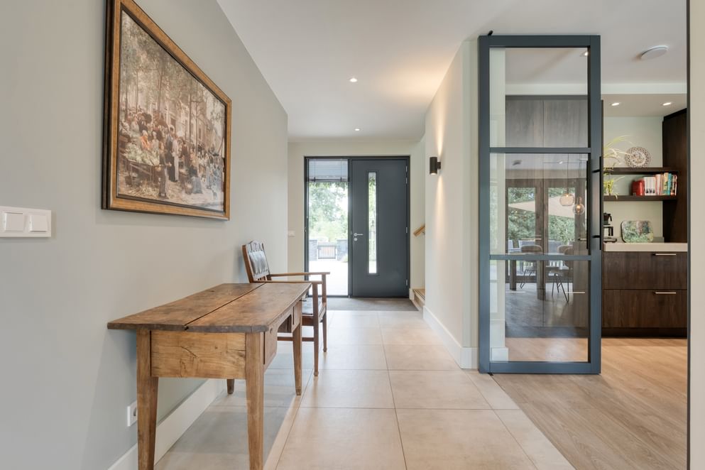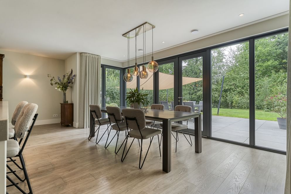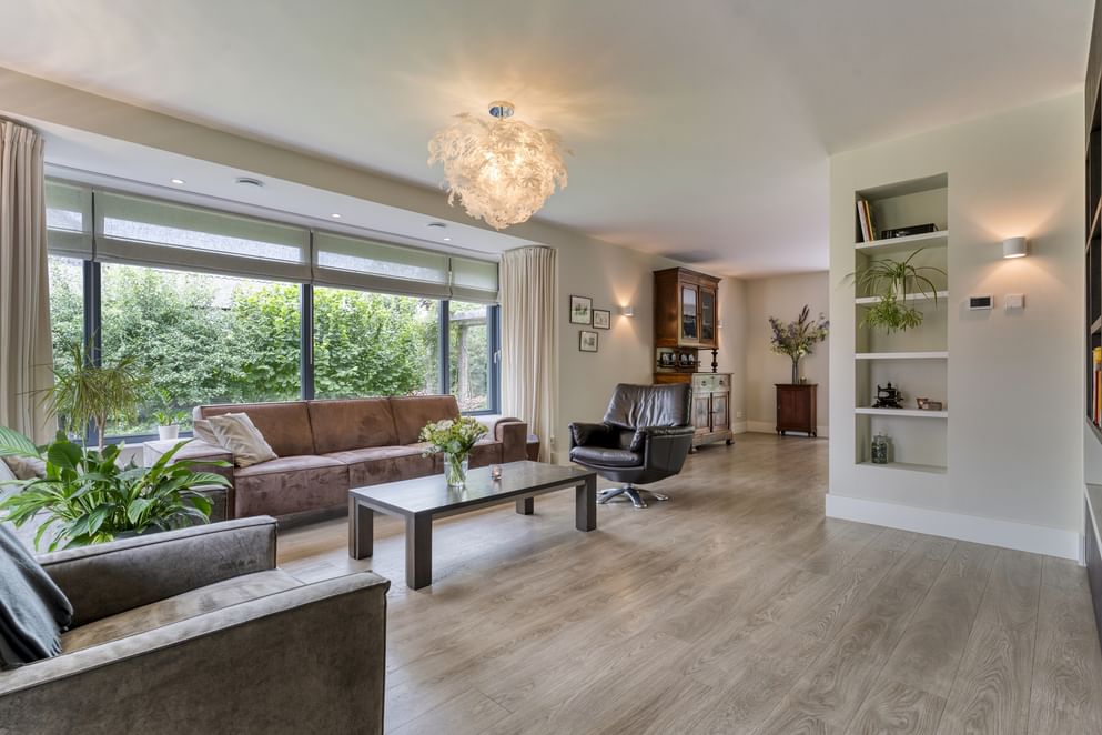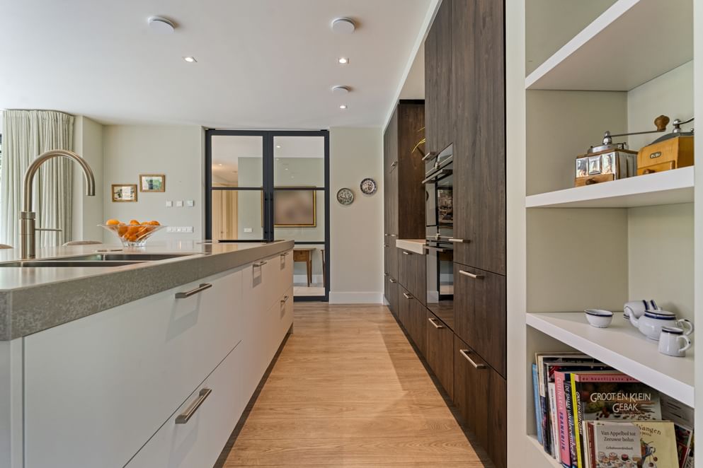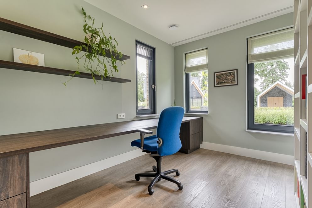 Via de overdekte entree kom je binnen in de lichte hal met een imposante trapopgang naar de eerste verdieping. Naast de garderobe bevindt zich een modern zeer ruim toilet. Aan de overkant van de hal bevindt zich de indrukwekkende woonkeuken met een groot kookeiland en alle denkbare hoogwaardige inbouwapparatuur. De eetkamer grenst direct aan de keuken en kijkt prachtig uit over de tuin en heeft openslaande deuren naar het terras. De woonkamer is sfeervol en knus ingedeeld, voorzien van een maatwerk kastenwand. De werkkamer ligt aan de voorzijde met zicht naar de oprit en biedt ruimte voor een kantoor of rustige werk-/leesruimte. Vanuit de centrale gang loop je ook naar het achterste deel van de woning, welke plaats biedt aan een technische ruimte, een zeer goed geoutilleerde bijkeuken met de aansluitingen voor een wasmachine en droger op hoogte en een royale slaapkamer met uitzicht op de tuin. Een superfijne plek om in alle rust wakker te worden. Deze kamer beschikt over een doorloopkast met toegang tot een luxe badkamer met inloopdouche, dubbele wastafel en douchetoilet.