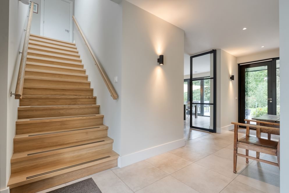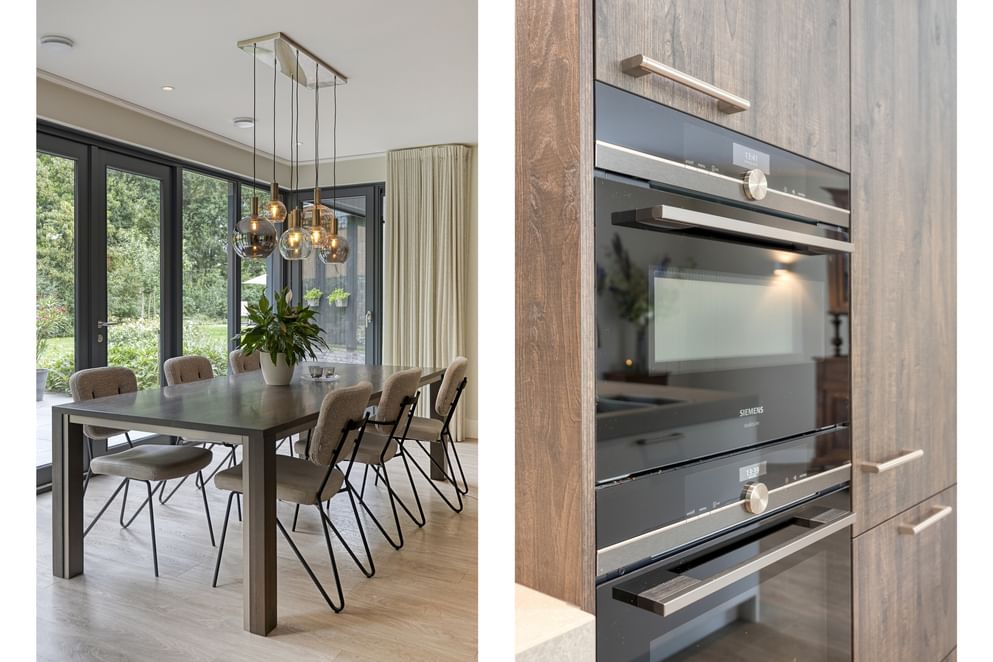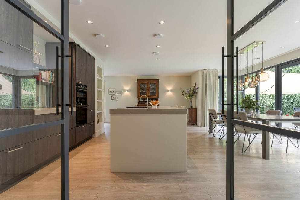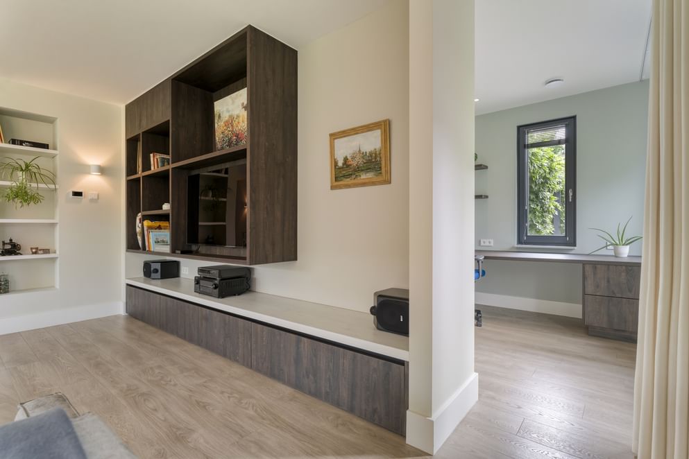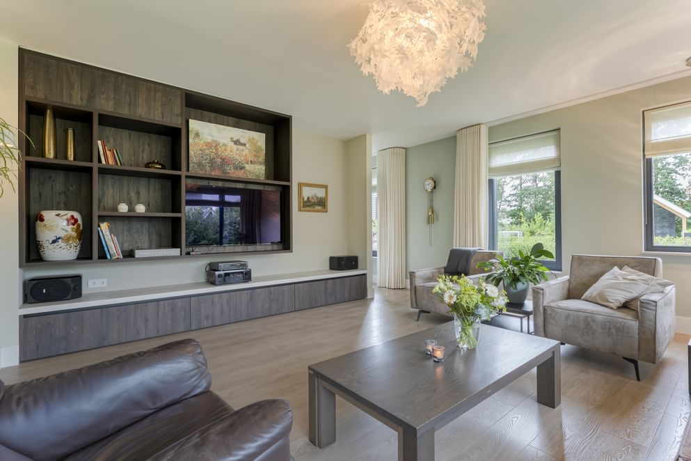 Via de overdekte entree kom je binnen in de lichte hal met een imposante trapopgang naar de eerste verdieping. Naast de garderobe bevindt zich een modern zeer ruim toilet. Aan de overkant van de hal bevindt zich de indrukwekkende woonkeuken met een groot kookeiland en alle denkbare hoogwaardige inbouwapparatuur. De eetkamer grenst direct aan de keuken en kijkt prachtig uit over de tuin en heeft openslaande deuren naar het terras. De woonkamer is sfeervol en knus ingedeeld, voorzien van een maatwerk kastenwand. De werkkamer ligt aan de voorzijde met zicht naar de oprit en biedt ruimte voor een kantoor of rustige werk-/leesruimte. Vanuit de centrale gang loop je ook naar het achterste deel van de woning, welke plaats biedt aan een technische ruimte, een zeer goed geoutilleerde bijkeuken met de aansluitingen voor een wasmachine en droger op hoogte en een royale slaapkamer met uitzicht op de tuin. Een superfijne plek om in alle rust wakker te worden. Deze kamer beschikt over een doorloopkast met toegang tot een luxe badkamer met inloopdouche, dubbele wastafel en douchetoilet.