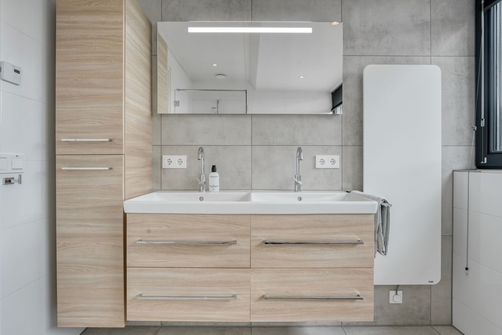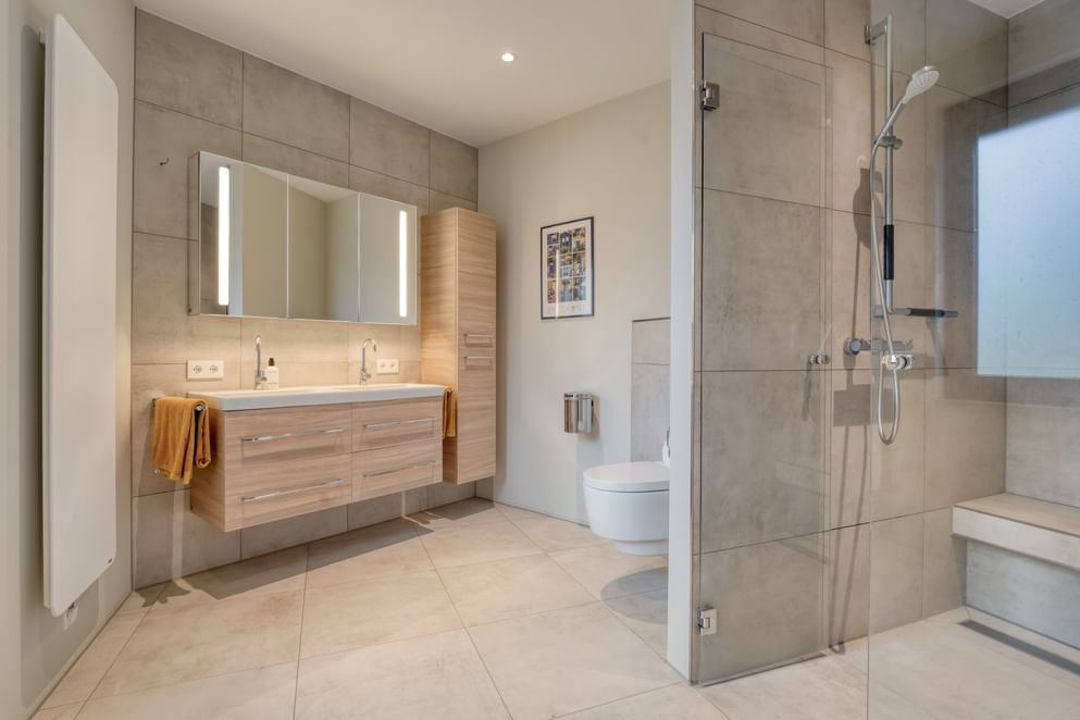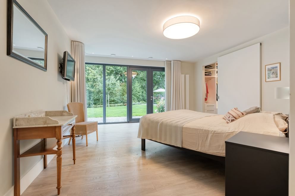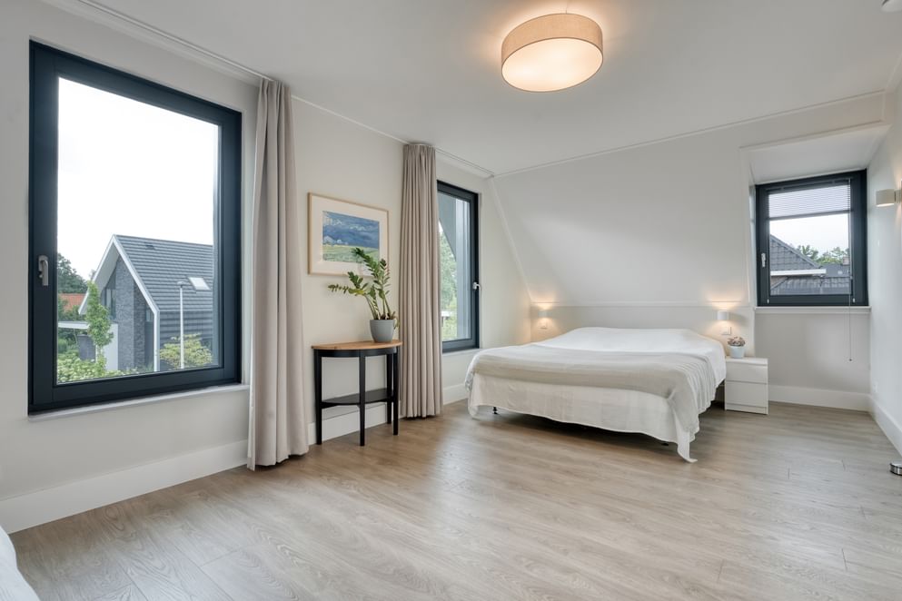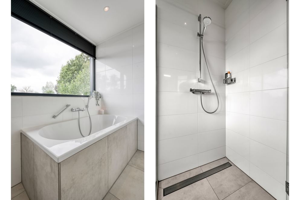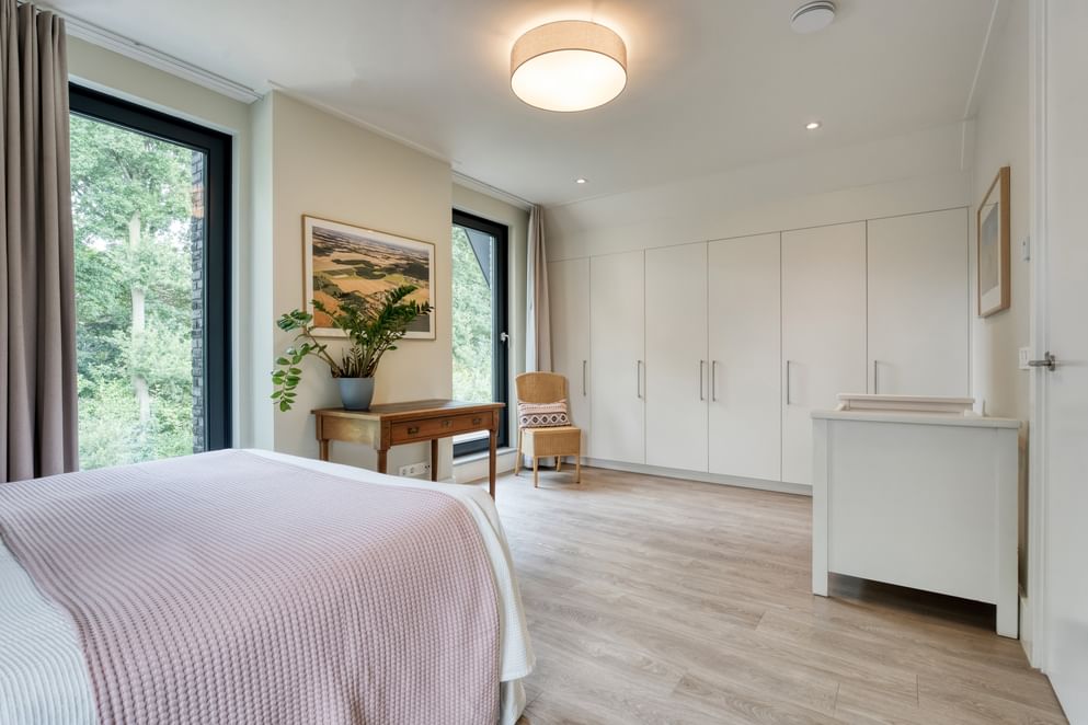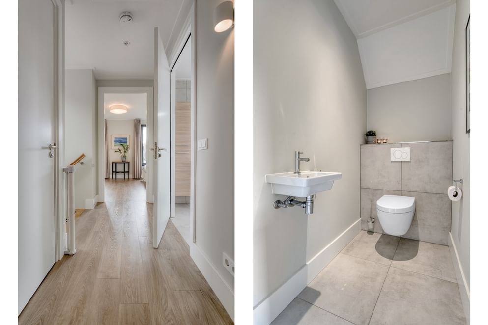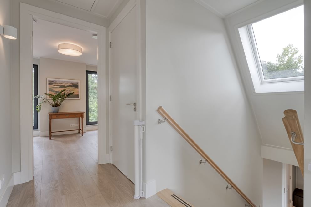De overloop geeft toegang tot twee ruime slaapkamers, beide met inbouwkasten, een tweede luxe badkamer met ligbad, dubbele wastafel, inloopdouche, en een separaat toilet. De afwerking is doorgetrokken in dezelfde hoogwaardige stijl als beneden. Ook is hier eenvoudig een 3e slaapkamer te realiseren.