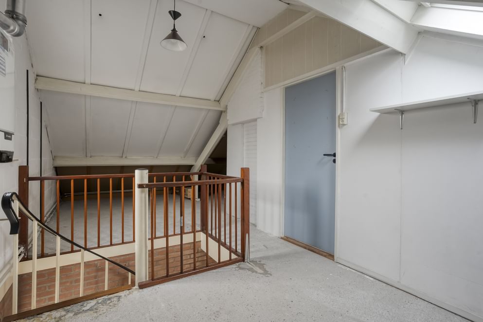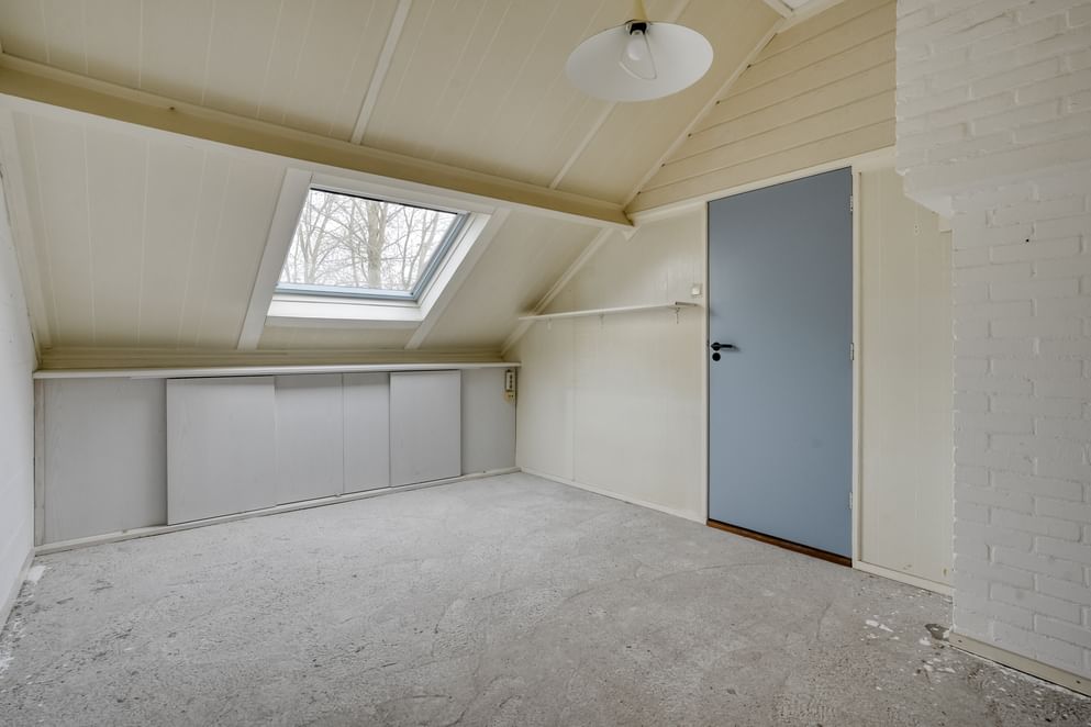 De tweede verdieping is bereikbaar via een vaste trap en biedt volop praktische ruimte. Hier bevinden zich de witgoedaansluitingen en is er voldoende plek voor het creëren van extra bergruimte. Vanaf hier is een extra kamer bereikbaar, die nog volledig naar eigen wens kan worden ingericht, bijvoorbeeld als slaap-, werk- of hobbyruimte. Daarnaast is er onder de knieschotten van het dak extra opbergruimte aanwezig, ideaal voor het netjes opbergen van spullen.