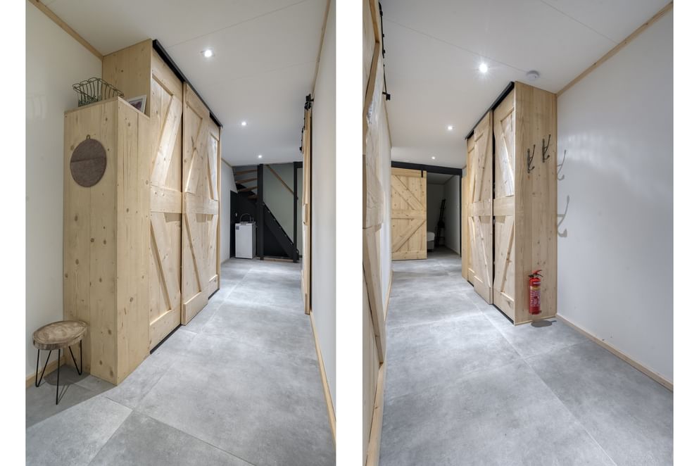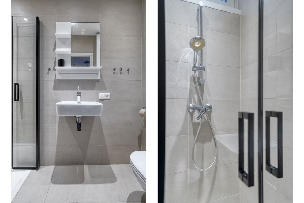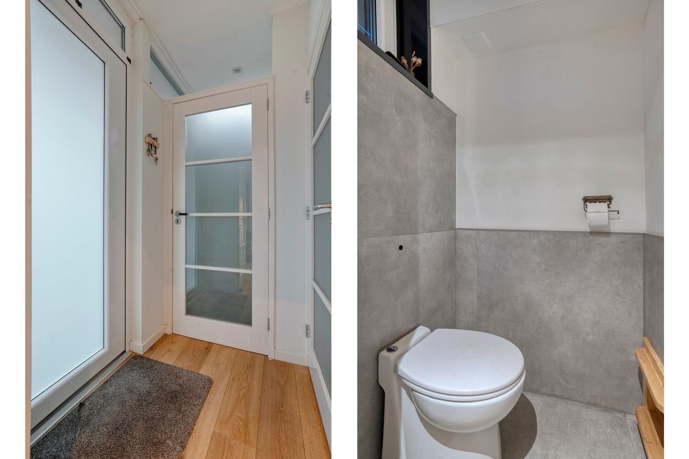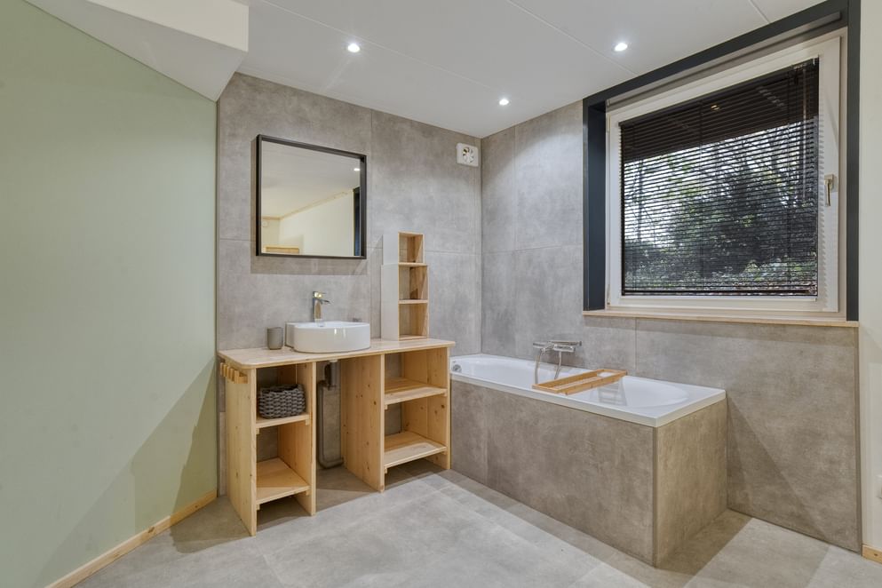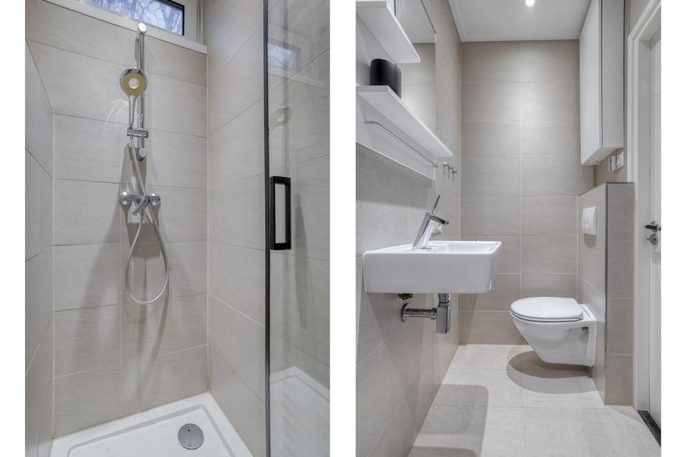 Vanaf de voorzijde stap je binnen in de entree, die toegang geeft tot de de royale woonkamer, badkamer en het souterrain. De moderne badkamer is stijlvol afgewerkt en voorzien van een inloopdouche, toilet en wastafelmeubel.