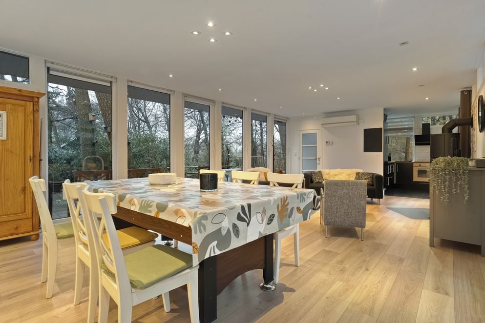 De woonkamer is heerlijk ruim en biedt volop flexibiliteit in de indeling van een eethoek en zithoek. Grote raampartijen zorgen voor een warme, lichte sfeer, terwijl de houtkachel en de sfeervolle inrichting het geheel extra knus en uitnodigend maken.