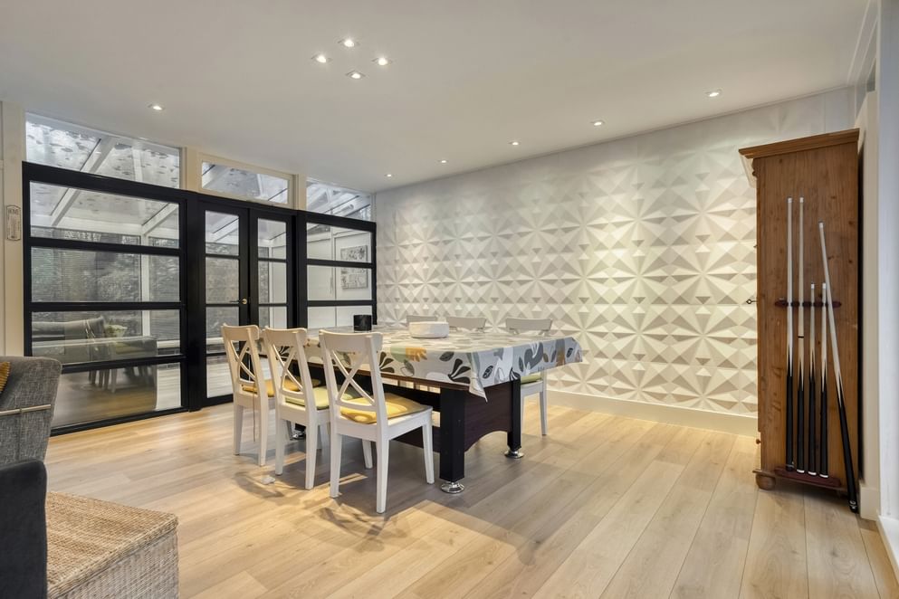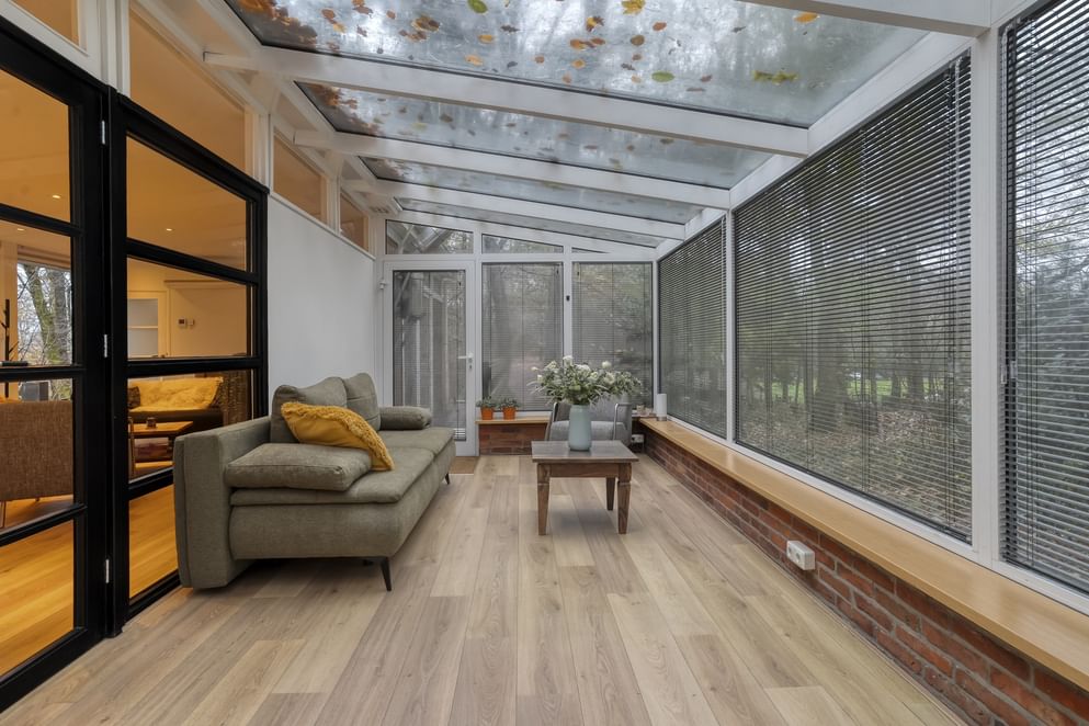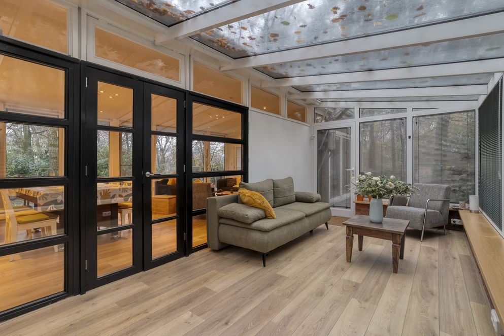 Aangrenzend bevindt zich de tuinkamer: een lichte, serene ruimte met prachtig uitzicht op het omliggende groen. Een heerlijke plek om tot rust te komen, ongeacht het seizoen.