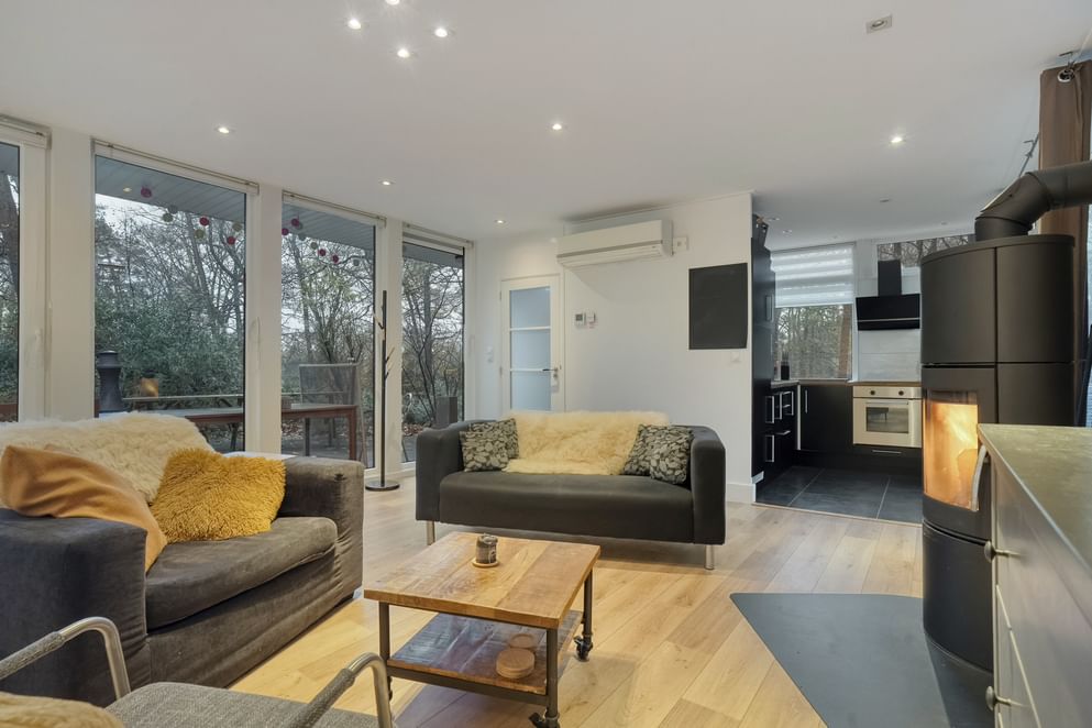 - Woonkamer voorzien van vele ramen en een houtkachel