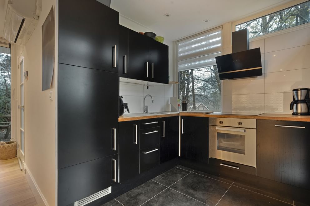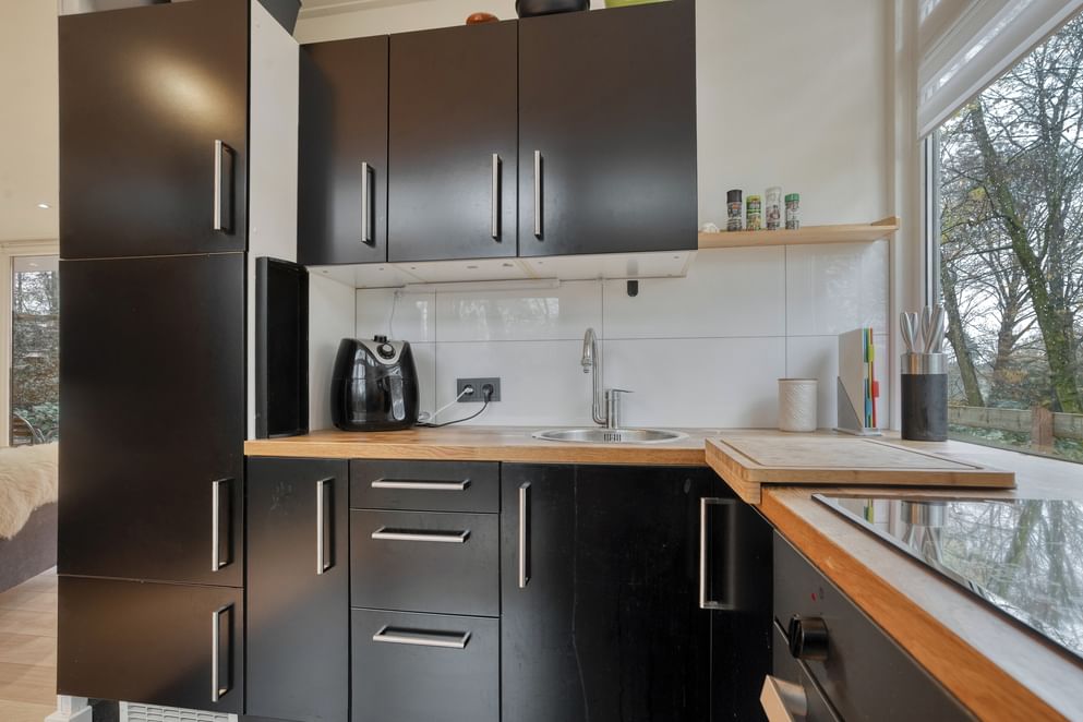 De halfopen L-vormige keuken sluit perfect aan bij de sfeer van de woning. Met donkere fronten, een houtlook werkblad en praktische inbouwapparatuur is deze keuken zowel stijlvol als functioneel.