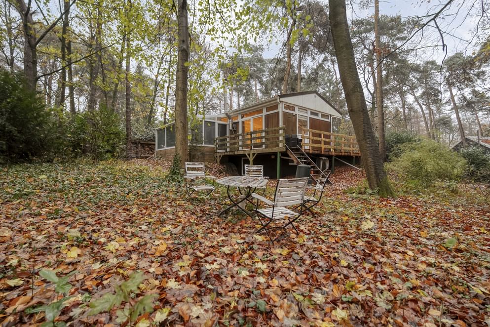 De bungalow ligt idyllisch verscholen tussen de bomen en is via een oprit bereikbaar. De rondom gelegen tuin sluit prachtig aan op de natuurlijke omgeving, met veel groen, gras, bomen en struiken.