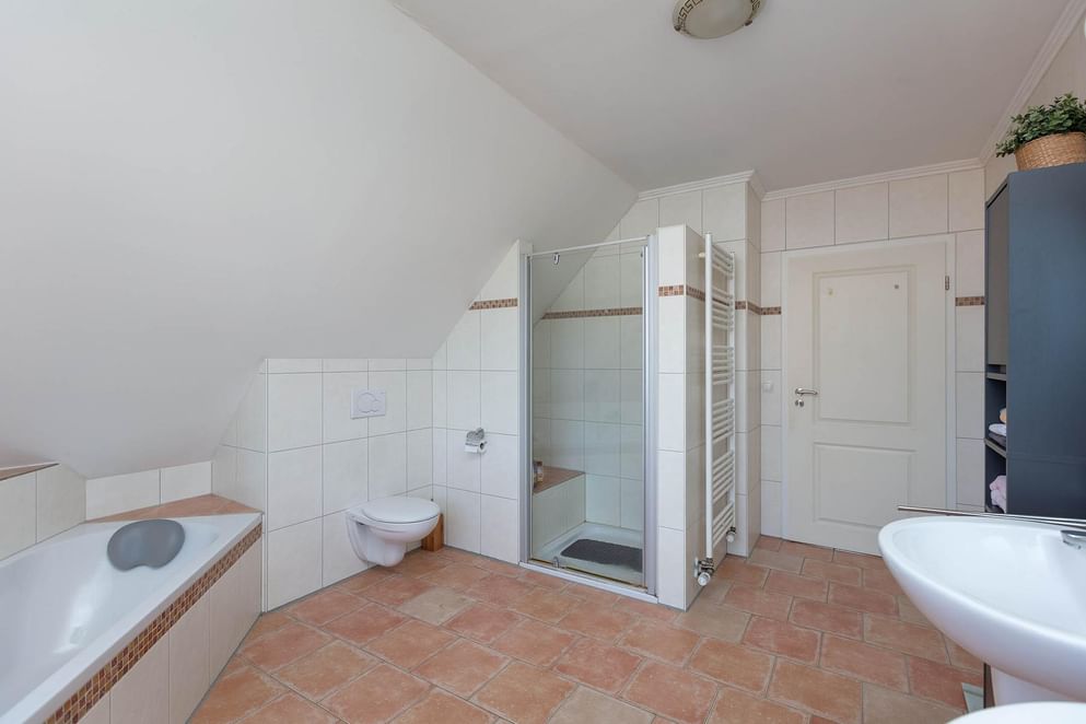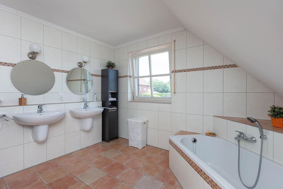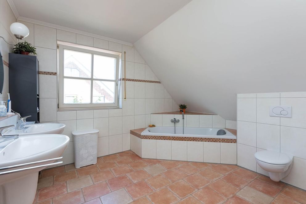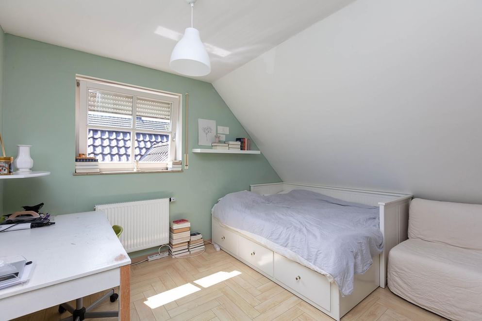 De overloop geeft toegang tot drie slaapkamers en een kleinere kamer welke momenteel in gebruik is als kantoor. In de kleinere kamer is tevens de opstelplaats van de C.V.-installatie. De twee kamers aan de achterzijde beschikken over een dakkapel met uitzicht op de tuin. De geheel betegelde royale badkamer is voorzien van een ligbad, grote inloopdouche met glazen deur, dubbele wastafel en een vrijdragend toilet. Uiteraard is de badkamervloer v.v. comfortabele vloerverwarming.