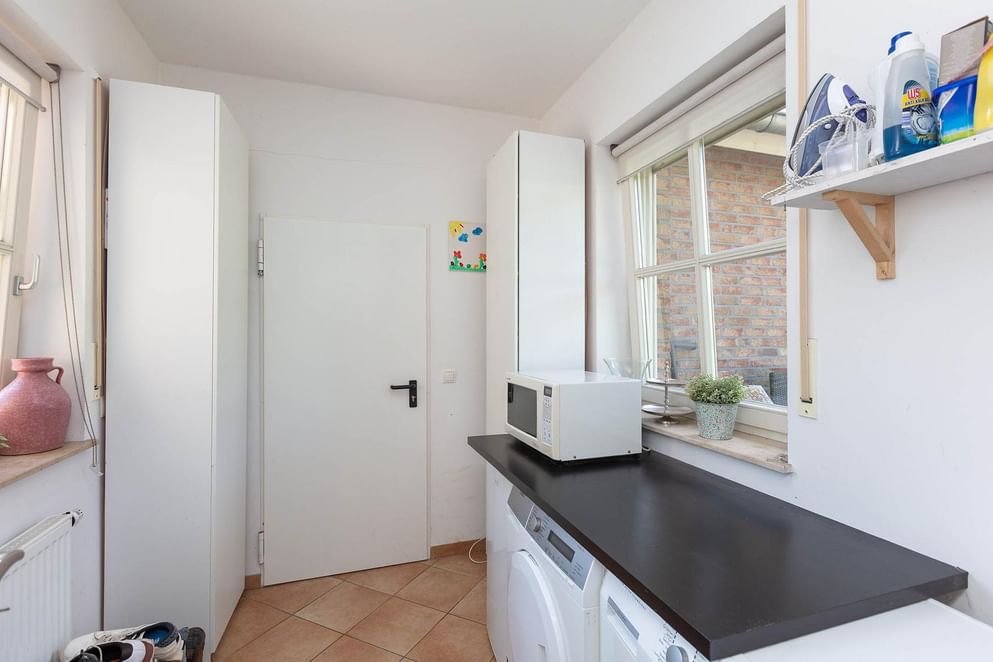 Achterin de garage is een doorgang naar de berging, ideaal voor stalling van bijvoorbeeld jouw tuingereedschap. De berging geeft toegang tot de achtertuin.