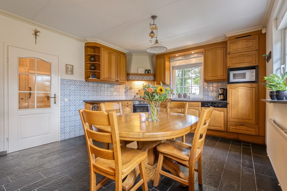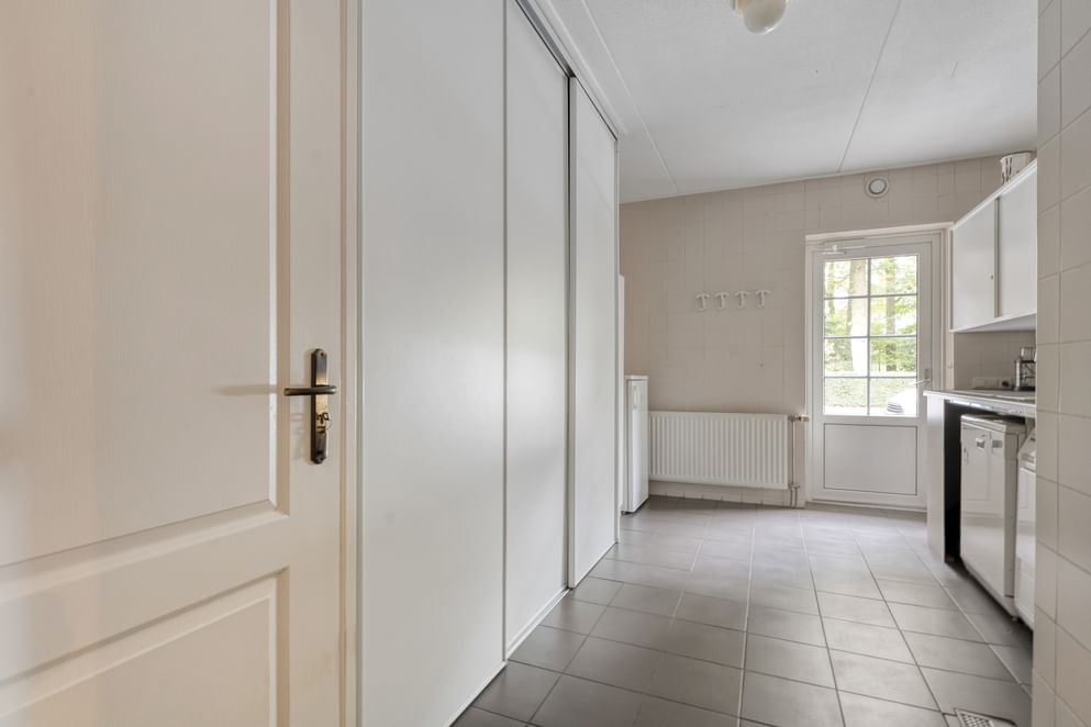 Entree, keuken v.v. gaskookplaat, afzuigkap, vaatwasser, koelkast en kunststofblad, woonkamer v.v. gashaard/schouw en schuifpui naar terras, eetkamer, toiletruimte v.v. toilet en wasbak, meterkast, berging/kantoorruimte, bijkeuken v.v. opstelplaats wasmachine en droger, slaapkamer, badkamer v.v. toilet, wastafel en douche, garage.