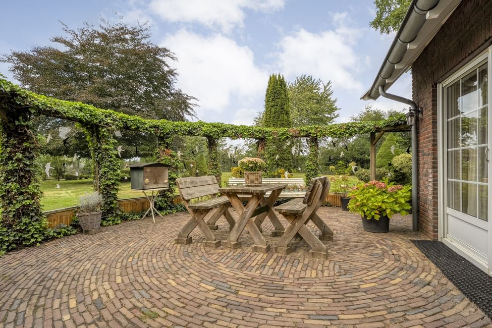 Vanaf de Amsinksweg rijd je over je eigen oprijlaan naar een door de jaren heen zeer goed onderhouden erf. De tuin rondom de woning is bijzonder fraai aangelegd met een groot assortiment aan planten, heesters en bomen. Op verschillende terrassen kun je genieten van de schitterende tuin en het weidse uitzicht aan de achterzijde van de woning. Op het perceel van 8.300 m² mag links op het voorerf nog een schuur gebouwd worden van 150 m². In de tuin is een eigen bron geslagen, waarvan je het heldere water perfect kunt gebruiken om de parkachtige tuin te besproeien.