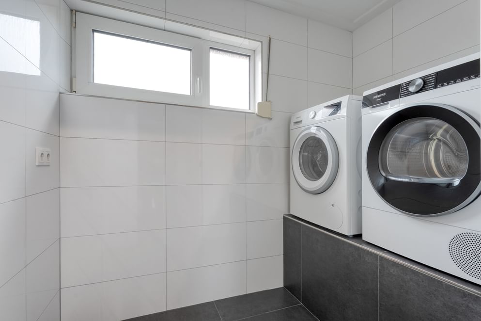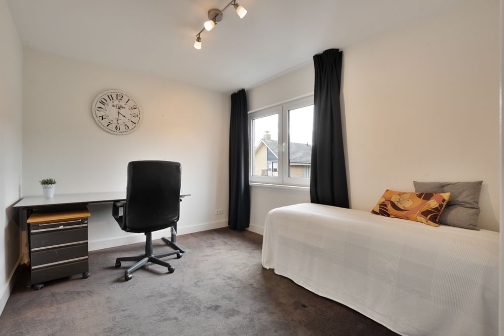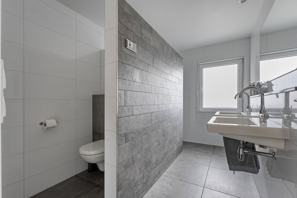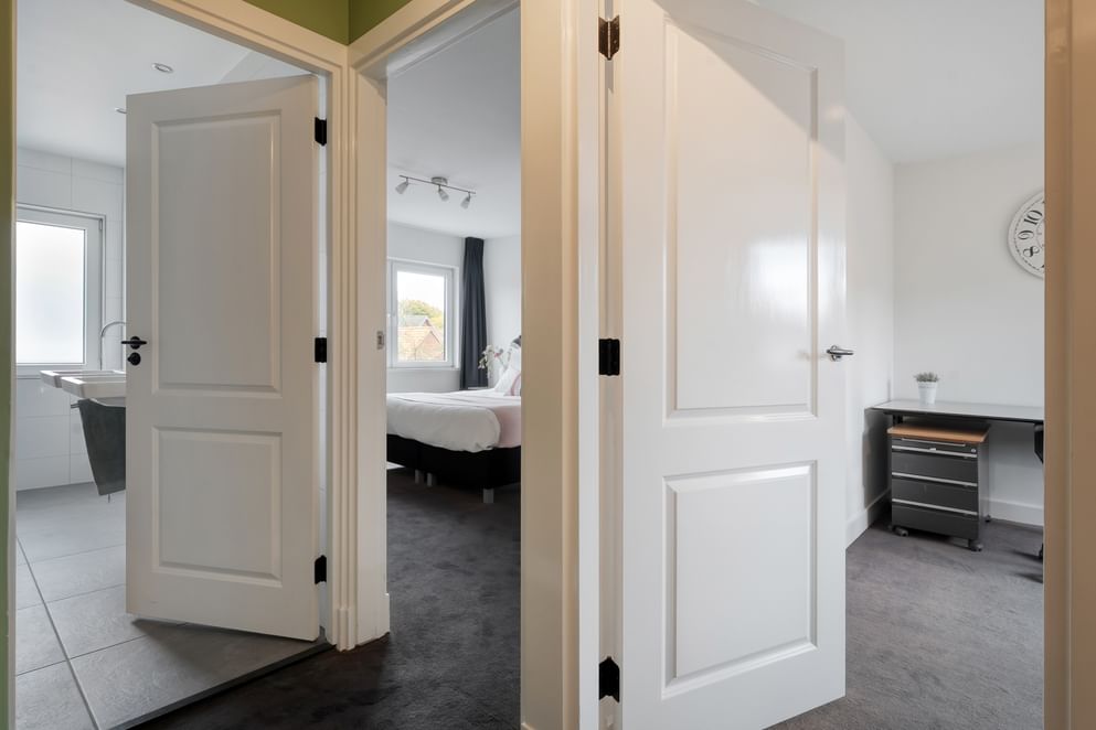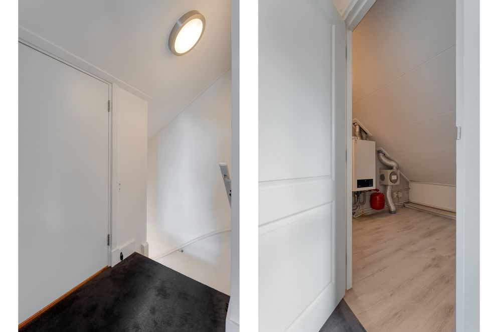 Op de eerste verdieping bevinden zich twee royale slaapkamers, waarvan één met inbouwkasten. De moderne badkamer is voorzien van een inloopdouche, dubbele wastafel, toilet en vloerverwarming. De aparte wasruimte biedt plaats aan de wasmachine en droger op werkhoogte. Via de vaste trap bereik je de ruime tweede verdieping met extra bergruimte, cv-ruimte en een fraai afgewerkte derde slaapkamer die ook dienst kan doen als logeerkamer of werkkamer.