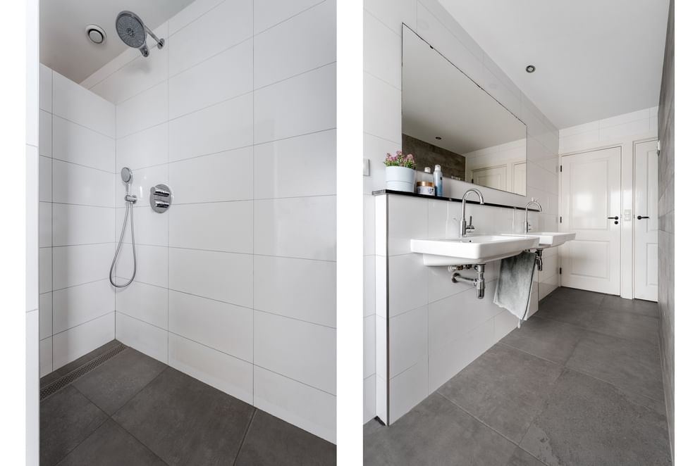 Overloop, twee ruime slaapkamers, wasruimte, moderne badkamer met inloopdouche, dubbele wastafel, vloerverwarming en toilet.