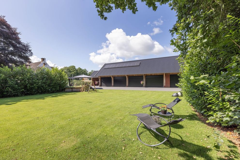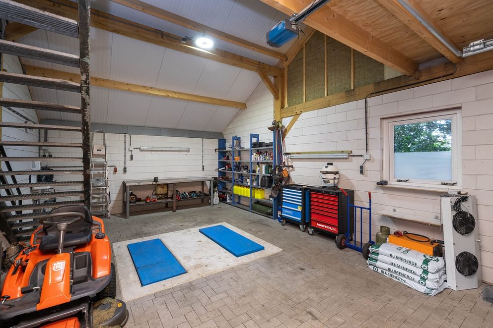Achter op het perceel bevindt zich een in 2018 gebouwde vrijstaande schuur van steen, volledig geïsoleerd en uitgerust met vijf elektrische overheaddeuren. Binnenin bevindt zich een kantoorruimte met vloerverwarming, ideaal voor werken aan huis of hobbygebruik. Voor de schuur is een carport aanwezig met ruimte voor twee auto's.