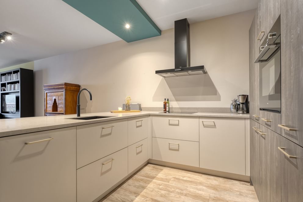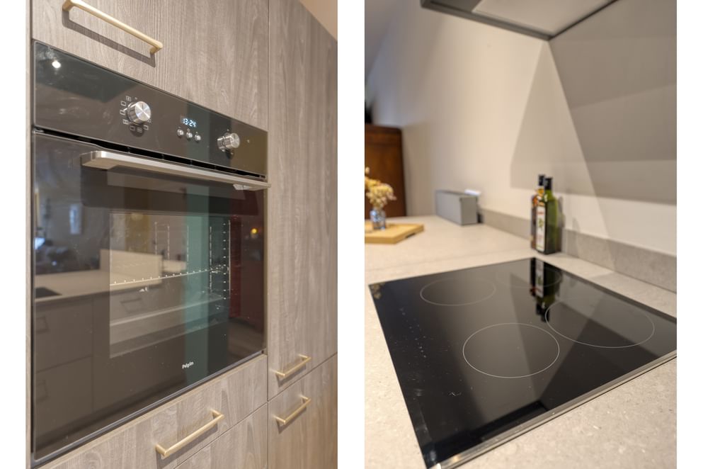 - De moderne keuken is voorzien van: koel-/vriescombinatie, vaatwasser, inductiekookplaat, afzuigkap, combi-oven, keramisch werkblad en een kraan met Quooker