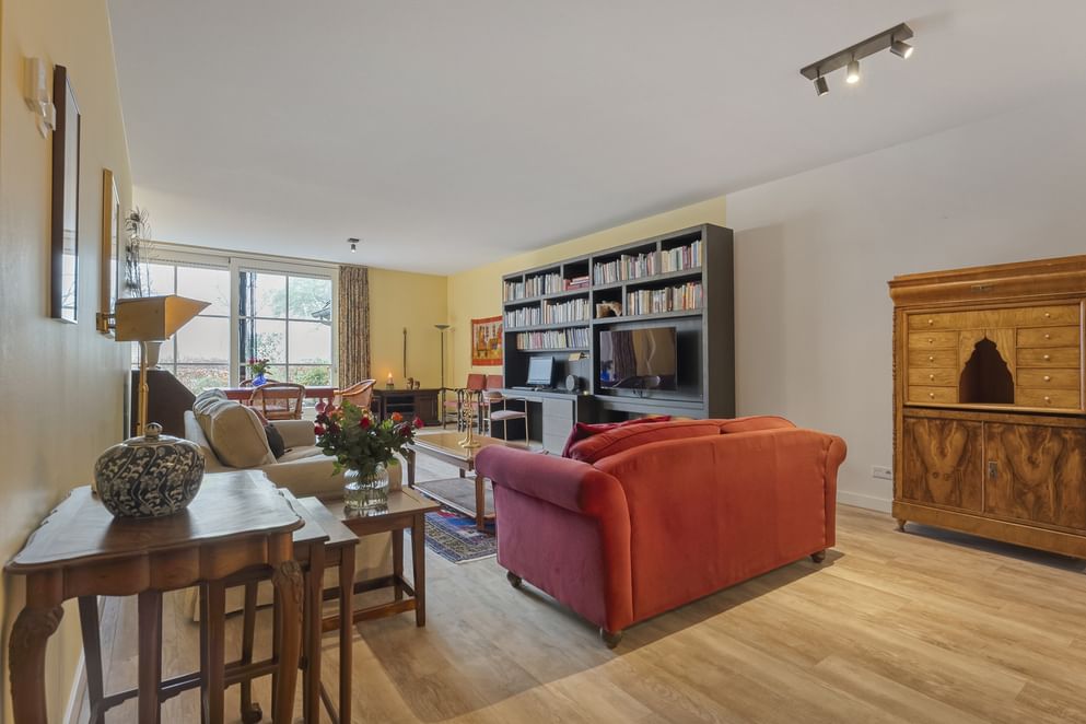 Vanuit de woonkamer heb je toegang tot de tuin met een fijn terras van waar je een mooi uitzicht hebt op de tuin en de karakteristieke bomen rondom het gebouw. Tevens is er een vrijstaande berging voor het stallen van een fiets of tuinmeubilair.