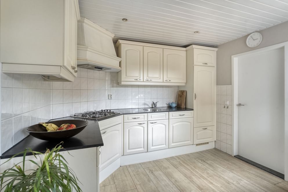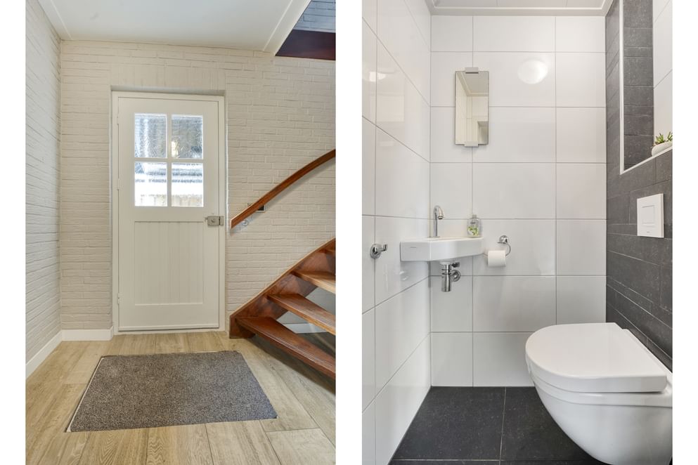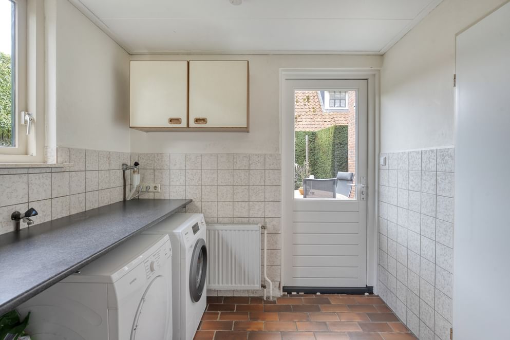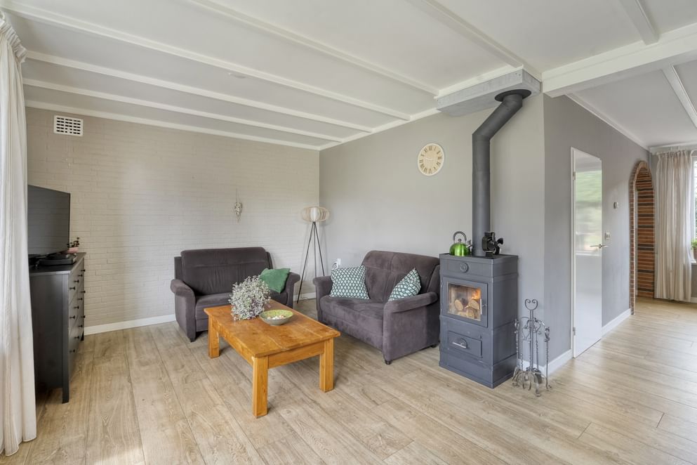Je komt binnen in de ruime hal met toilet en trapopgang. Vanuit de hal loop je door naar de woonkamer, die is voorzien van een sfeervolle houtkachel en grote raampartijen die zorgen voor een prettige lichtinval. De woonkamer staat in open verbinding met de keuken. De keuken is praktisch ingedeeld en voorzien van diverse inbouwapparatuur. Via de keuken bereik je de bijkeuken. Vanuit hier heb je toegang tot de achtertuin en de inpandige garage.