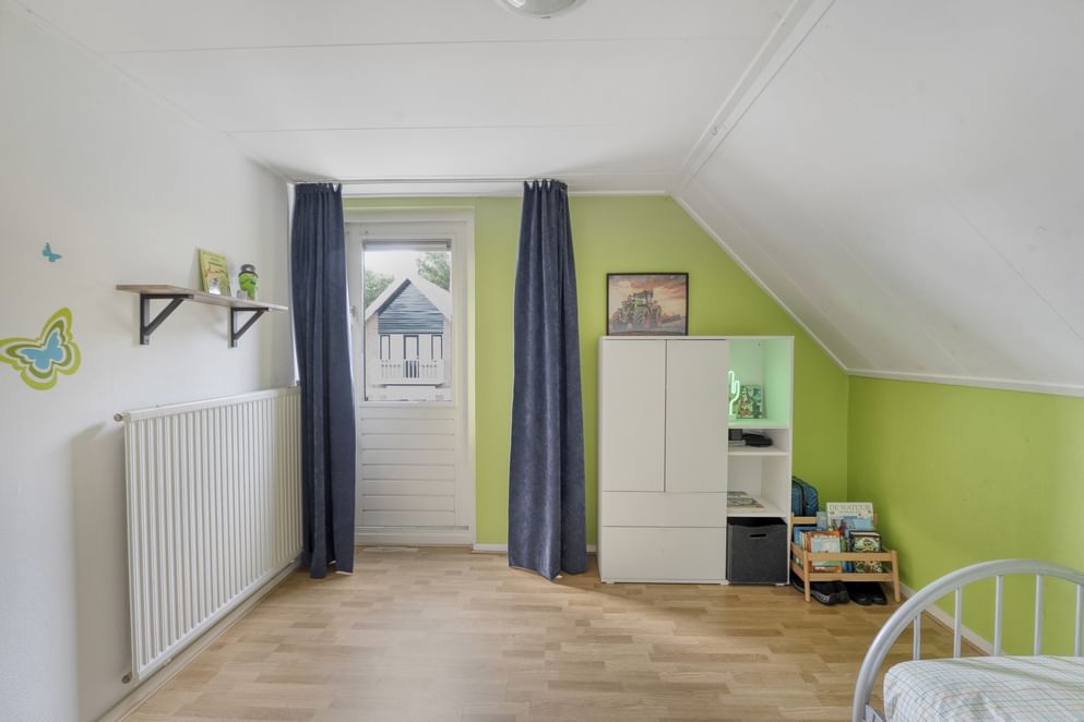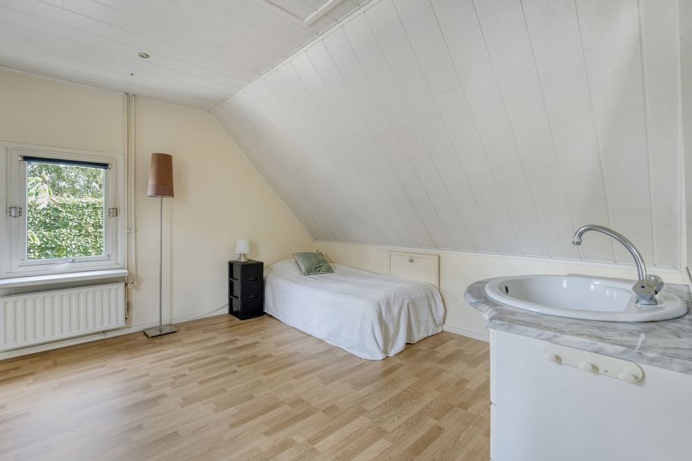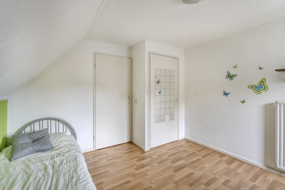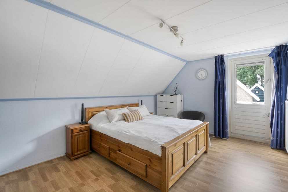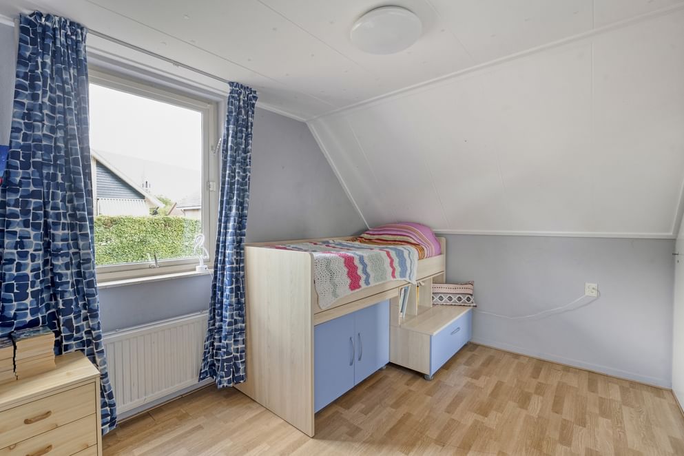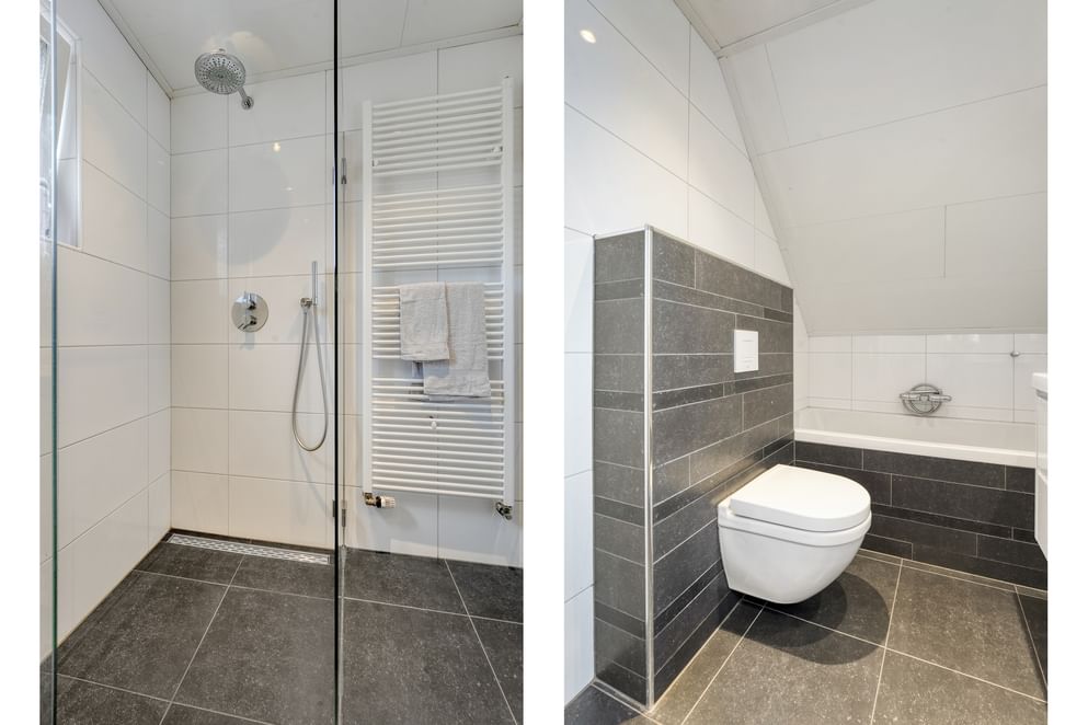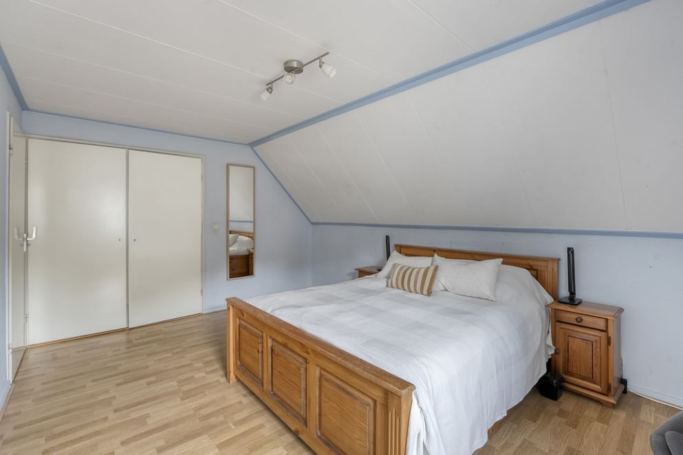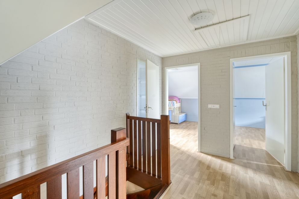 Via de vaste trap bereik je de overloop op de eerste verdieping. Hier bevinden zich vier ruime slaapkamers, elk met voldoende lichtinval. De moderne badkamer is compleet uitgerust met een ligbad, inloopdouche, toilet en wastafel. De ruimte is functioneel en comfortabel ingericht. Middels een doorloop over de zolder boven de garage, kom je in de ruime vierde slaapkamer.