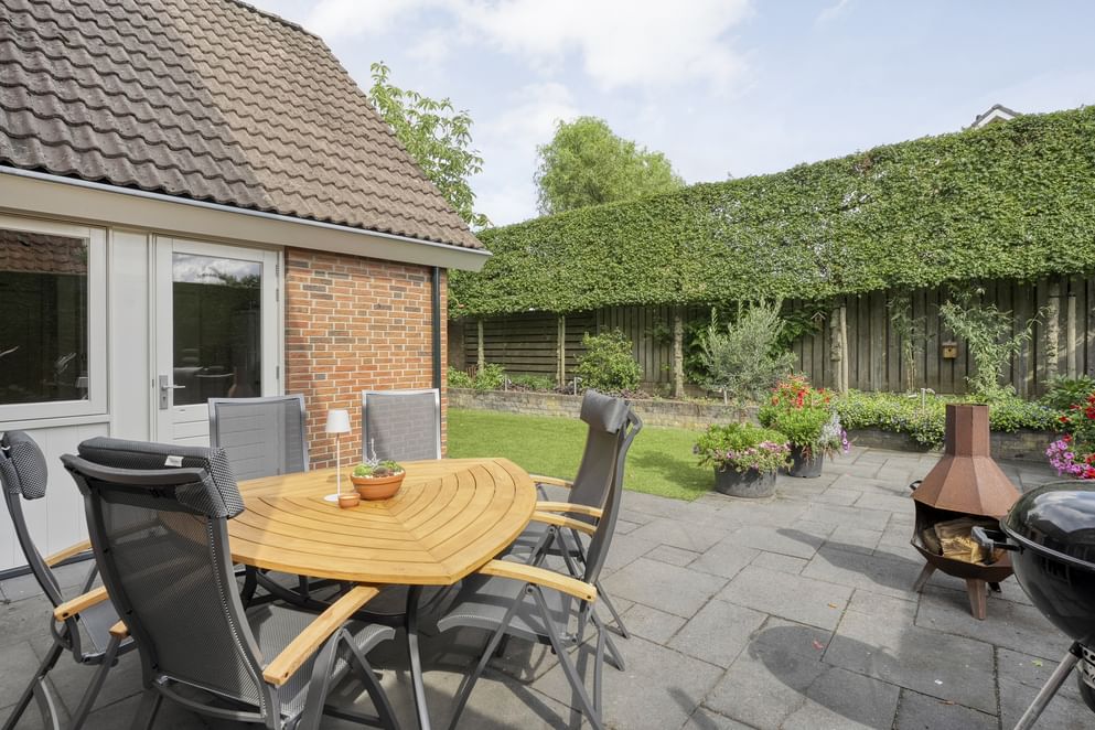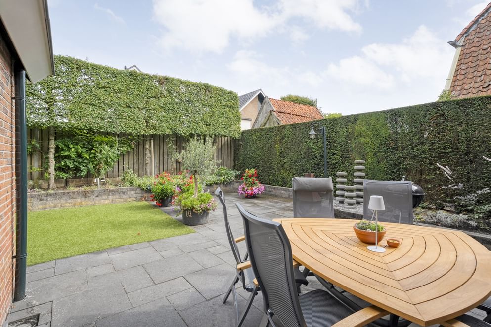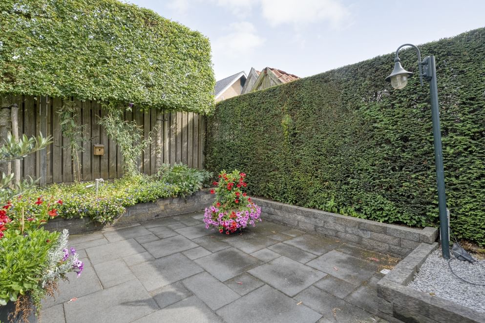 De achtertuin ligt op het oosten, waardoor je altijd kunt genieten van een ontbijt in de ochtendzon en welke je ook nog tot laat in de middag volop zon biedt. De tuin is onderhoudsvriendelijk aangelegd en beschikt over een achterom. Ook aan de voorzijde is een verzorgde tuin aanwezig.