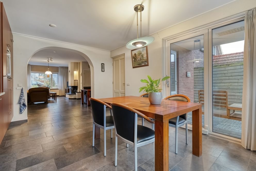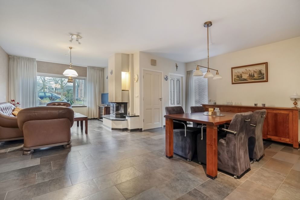 Via de voordeur stap je de binnen in de hal met trapopgang. Vanuit de hal loop je door naar de open eetkamer en woonkamer. Dankzij de open indeling, knusse houtkachel en de vloerverwarming voelt de ruimte comfortabel en warm aan. De woonkamer loopt over in de woonkeuken, voorzien van inbouwapparatuur en een schuifpui die toegang biedt tot de achtertuin. Aangrenzend aan de keuken is een achter portaal te vinden met toiletruimte.
