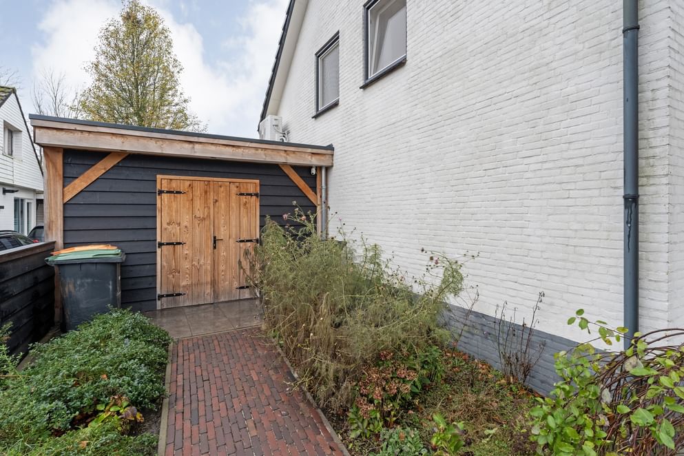 Naast de woning bevindt zich een houten berging voor fietsen of tuingereedschap, gemakkelijk bereikbaar via de overkapping.
