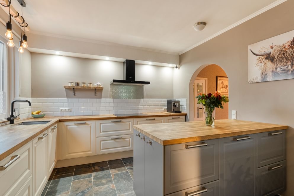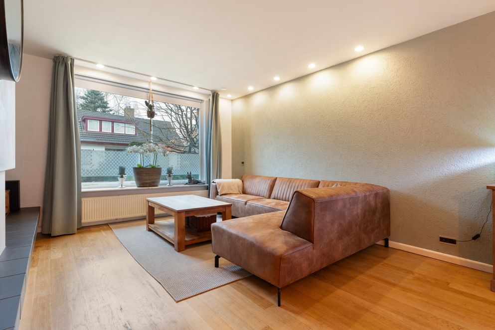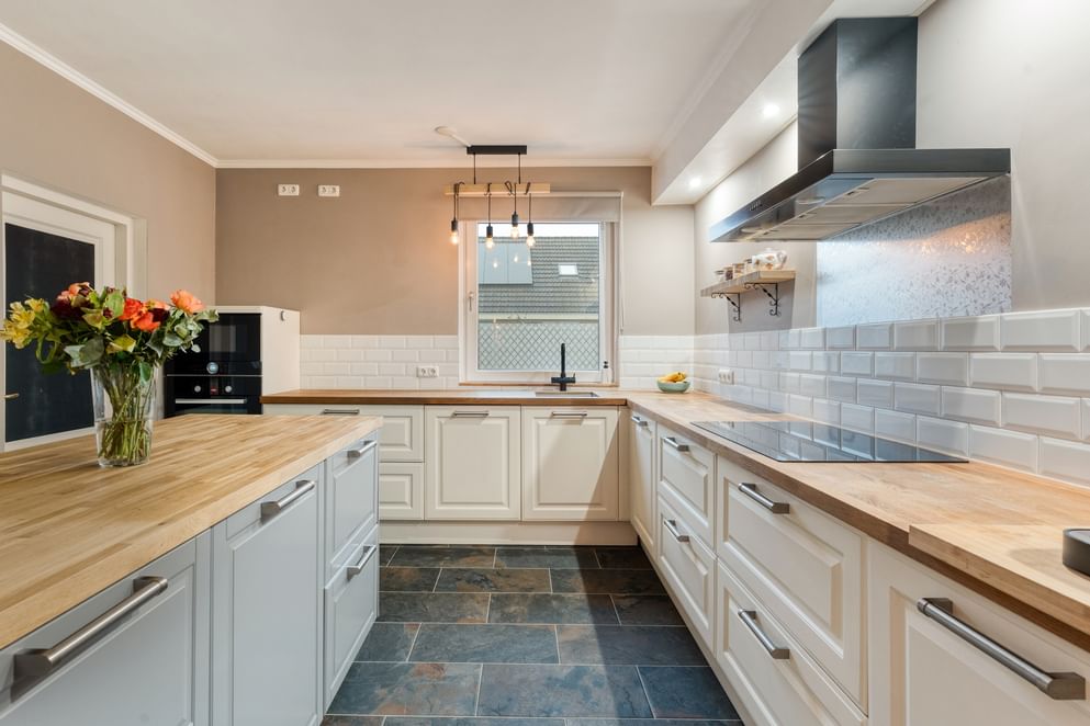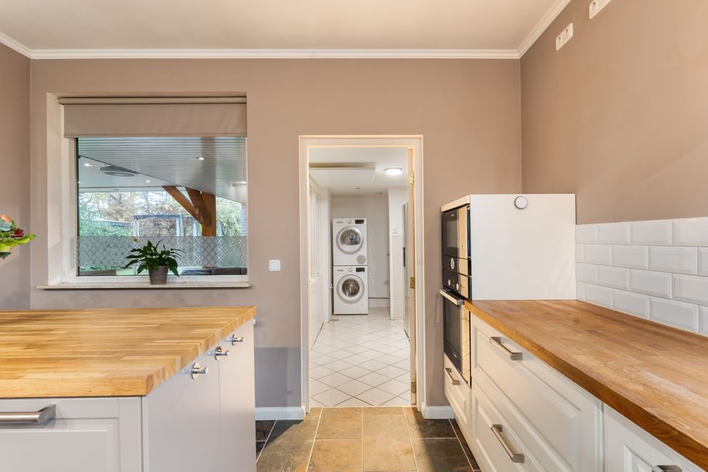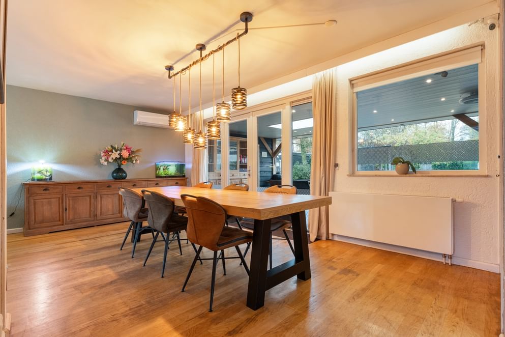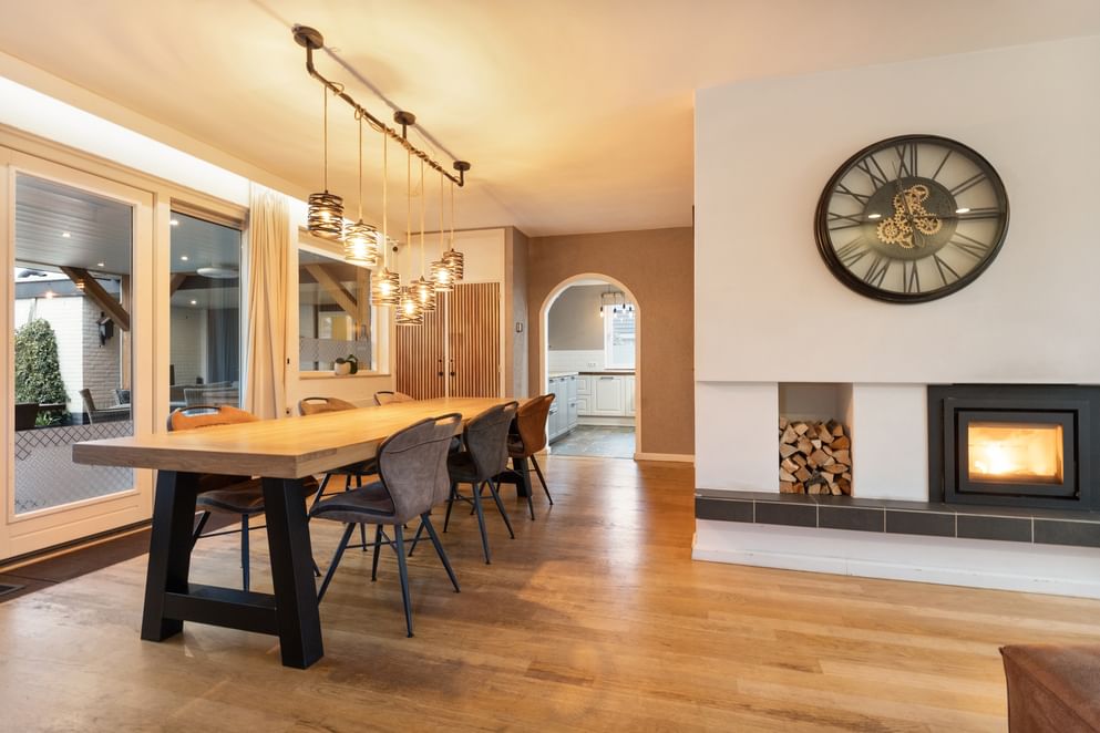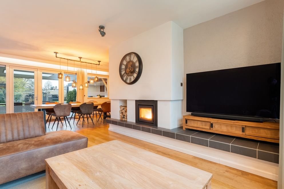 De woonkamer is heerlijk ruim, voorzien van veel lichtinval en een sfeervolle houtkachel. Er is voldoende plek voor een grote eettafel en een comfortabele zithoek. De woonkamer staat in open verbinding met de keuken, die in 2021 volledig is vernieuwd en is uitgerust met diverse inbouwapparatuur, een Quooker en veel bergruimte.
