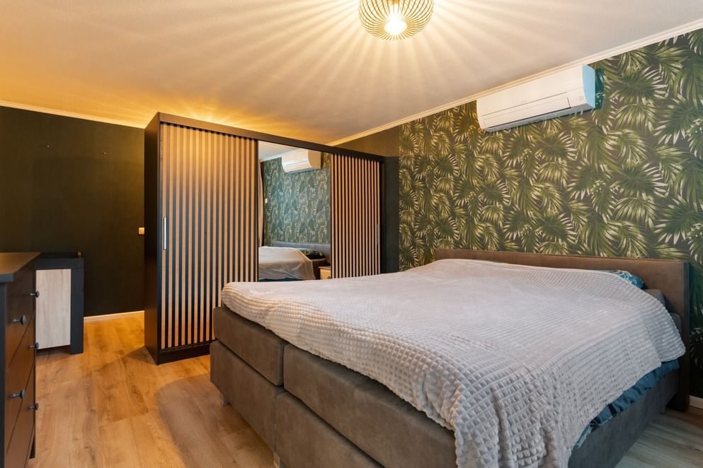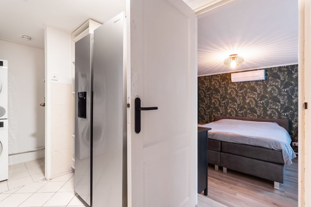 Aangrenzend ligt de praktische bijkeuken met witgoedaansluitingen en ruimte voor een koelkast en vriezer. Vanuit hier bereik je een tweede ruime slaapkamer, voorzien van airconditioning en ideaal voor gelijkvloers wonen.