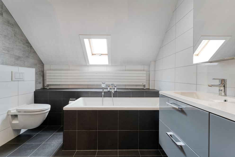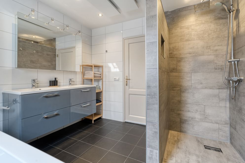 De moderne badkamer is compleet uitgerust met een ligbad, inloopdouche, toilet, dubbele wastafel met meubel en mechanische ventilatie.