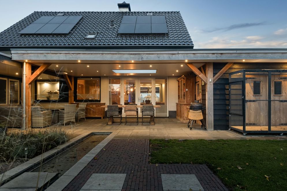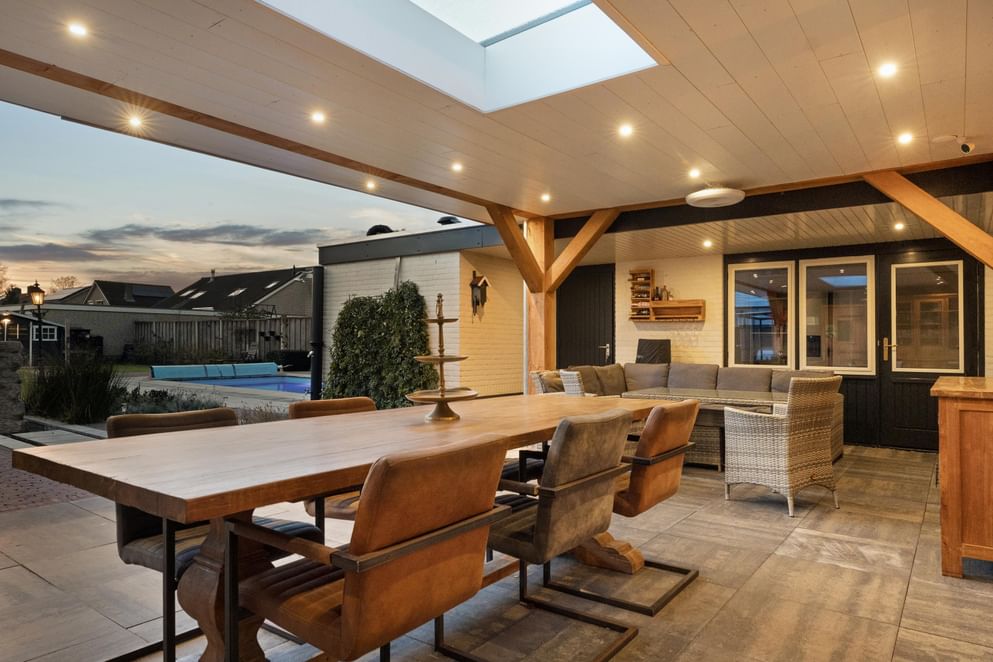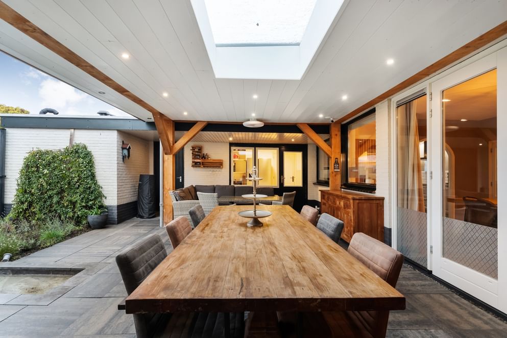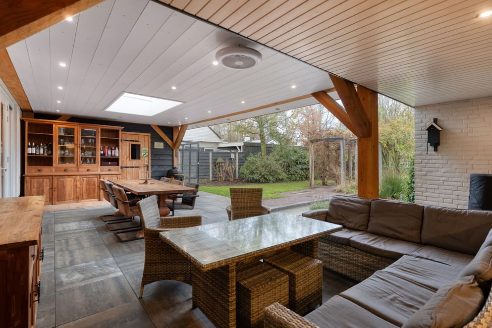 Via de openslaande deuren in de woonkamer loop je direct het prachtige overdekte terras op. Deze royale overkapping is voorzien van een lichtstraat en inbouwspots en biedt voldoende ruimte voor zowel een loungeset als een grote eettafel.