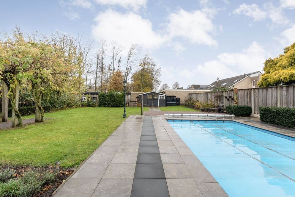 De achtertuin zelf is heerlijk ruim en vormt een echte privé-oase. Absolute eyecatcher is het ingebouwde zwembad, voorzien van een filtersysteem. Aangrenzend vind je een extra berging met toilet, ideaal te gebruiken als poolhouse of kleedruimte.