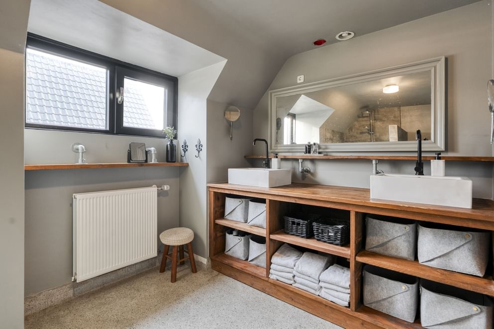 Bij het betreden van de eerste verdieping valt direct de prachtig ruime badkamer op. De badkamer is modern ingericht en voorzien van een royale inloopdouche, toilet, dubbele wastafel en een houten wastafelmeubel. Verder biedt de eerste verdieping toegang tot twee ruime slaapkamers die zijn voorzien van vaste kasten en voldoende daglicht.